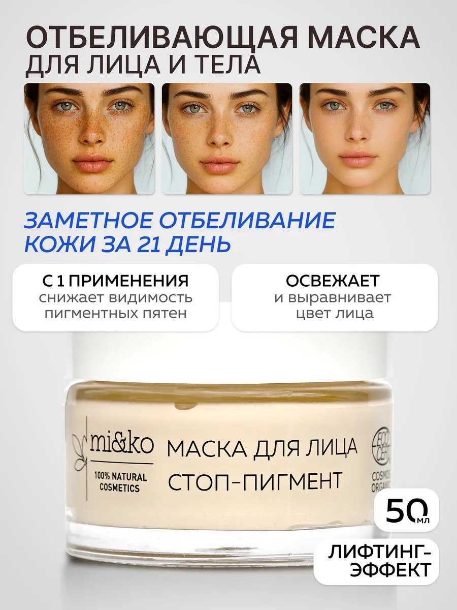 Отбеливающая маска для лица от пигментных пятен Miko - средство для «красной ковровой дорожки». Накануне важного события придаст коже сияние, освежит и выровняет цвет лица. Бестселлер mi&ko! Супероружие от веснушек и пигментных пятен и возрастных пятен. Маска от пигментных пятен уже за 1 применение снижает видимость пигментных пятен, если пигментное пятно находится в верхнем слое кожи. Экстракт маргаритки и диглюкозил галловой кислоты подавляют выработку меланина, угнетая ферменты тирозиназу и пероксидазу, гормоны эндотелин. Заметное отбеливание кожи за 21 день. Отбеливающая маска для лица выравнивает тон кожи. Гидролизованная пшеничная мука делает это эффективнее, чем койевая кислота, и уменьшает пигментные пятна за 30 дней. Стимулирует микроциркуляцию и вывод имеющегося пигмента за счет масла примулы вечерней. Отбеливающая маска оказывает омолаживающий и лифтинг-эффект благодаря эфирному маслу мирры. Маска отбеливающая для лица отлично работает курсом: 2-3 раза в неделю по вечерам в осенне-зимний период. Днем в любую погоду применяйте SPF-крем. Создает эффект «парадного лица» в любое время года. Работает с верхними слоями кожи: при глубокой пигментации используйте аппаратную коррекцию. Приятных покупок с mi&ko!