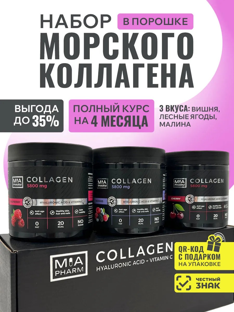 Коллаген морской порошок первого и третьего типа трех вкусов: вишня, лесные ягоды и малина от компании-производителя MIA PHARM (миа фарм) предназначен для поддержания здоровья суставов и связок, роста волос и ногтей.