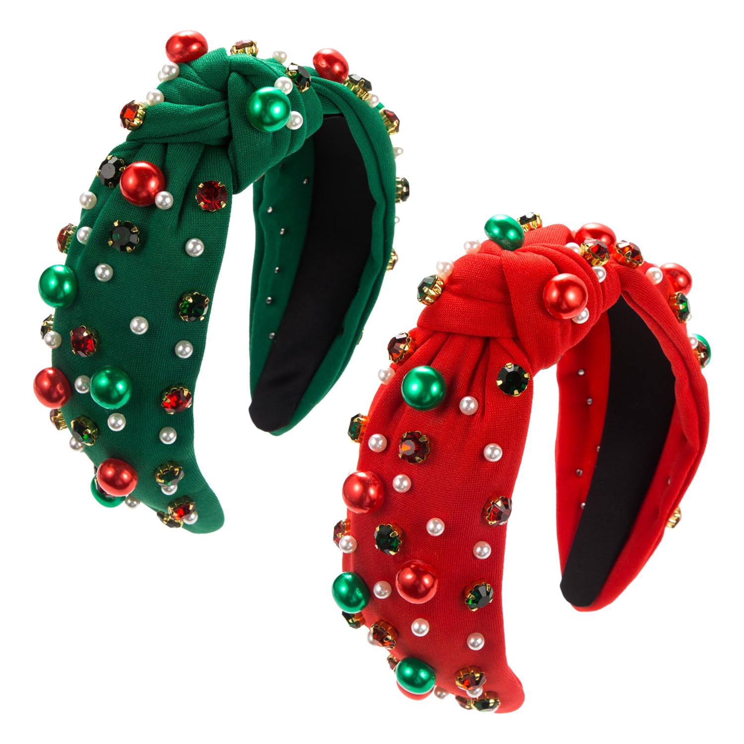 Miaija 2Pieces Chrismas Pearl Knotted Headband Green Red Wide Headbands Rhinestone Hair Hoop Fashion for Women Girls Hair Accessories