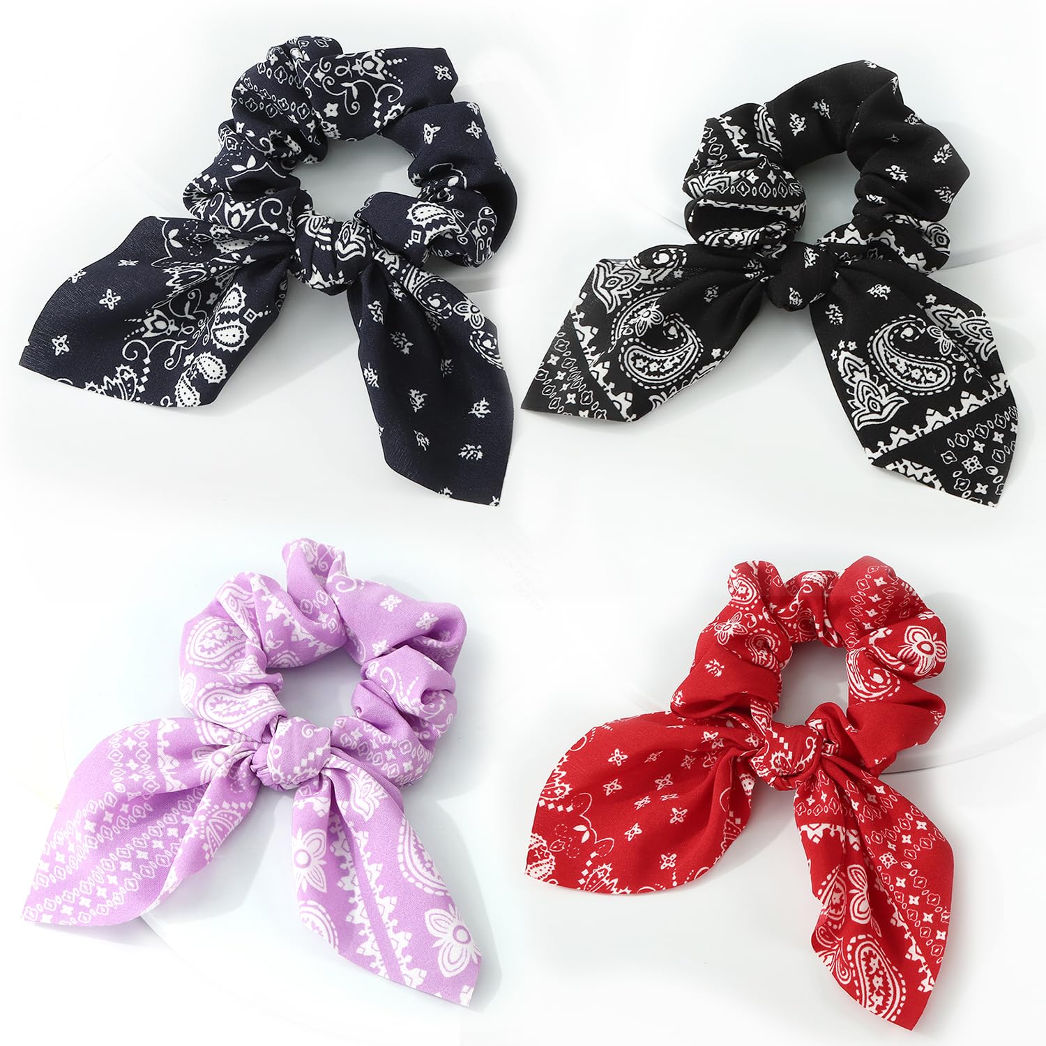 Miaija 4 Pieces Ribbon Bow Scrunchies Paisley Elastic Hair Band 4 Colors Chiffon Rope Scrunchy Leopard Ponytail Holders Hair Ties for Women Girls