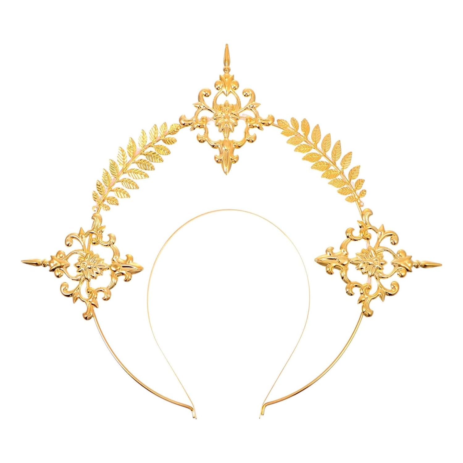 Miaija Halo Goddess Crown Headband Halloween Costume Headpiece with Leaves Jewelry Glittering Gold Hair Accessories for Women Girls Wedding Party