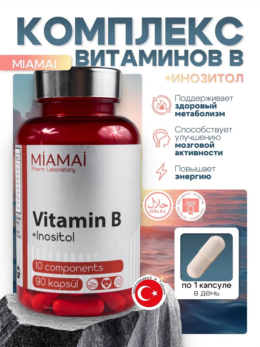 MIAMAI b complex + inositol 90 capsul - это комплекс витаминов группы B, содержащий активные формы витаминов, обеспечивающие их лучшее усвоение организмом.