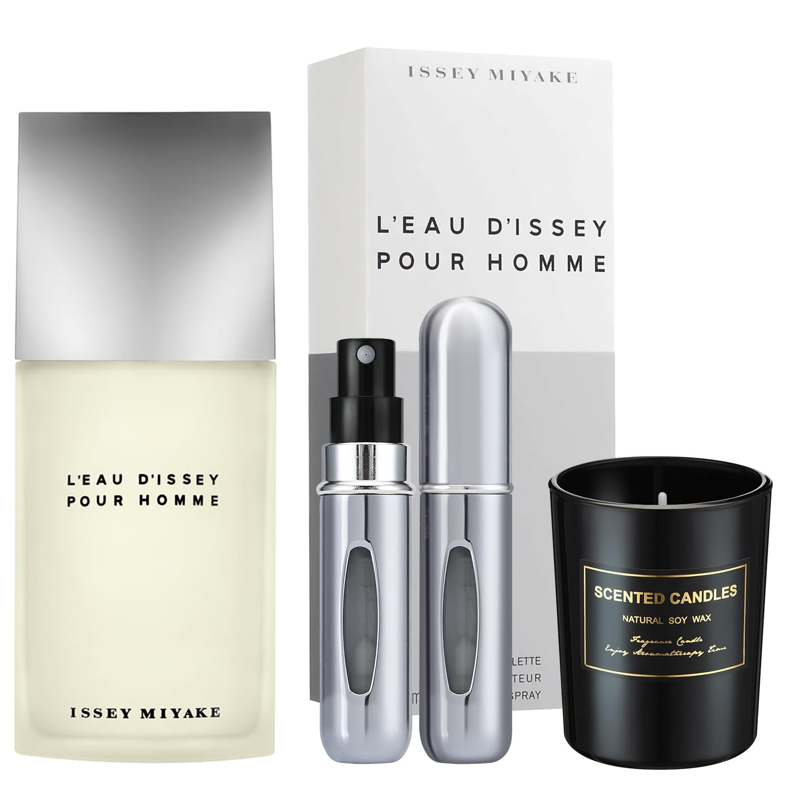 Micasa Fragrances L'eau Pour Homme Cologne for Men 4.2 oz EDT Spray Eau de Toilette - Gift Set Pack with Scented Soy Candle and Empty Travel Perfume Atomizer
