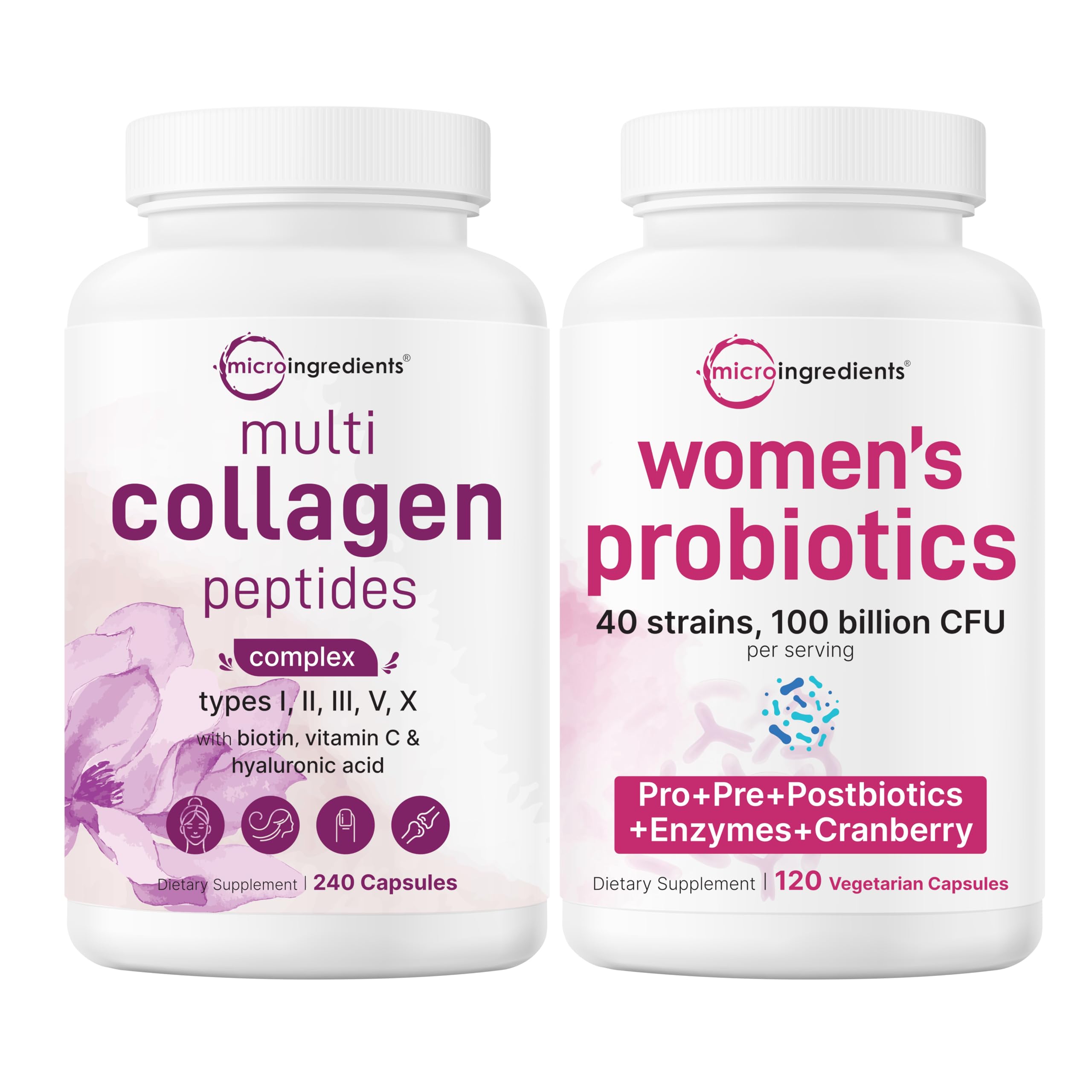 Micro Ingredients 8-in-1 Multi Collagen Pills & Women s Probiotics 100 Billion CFU Veggie Capsules | 2 Pack | Hydrolyzed Peptides + Hyaluronic Acid & Vitamin C | 40 Strains + Cranberry & D-Mannose