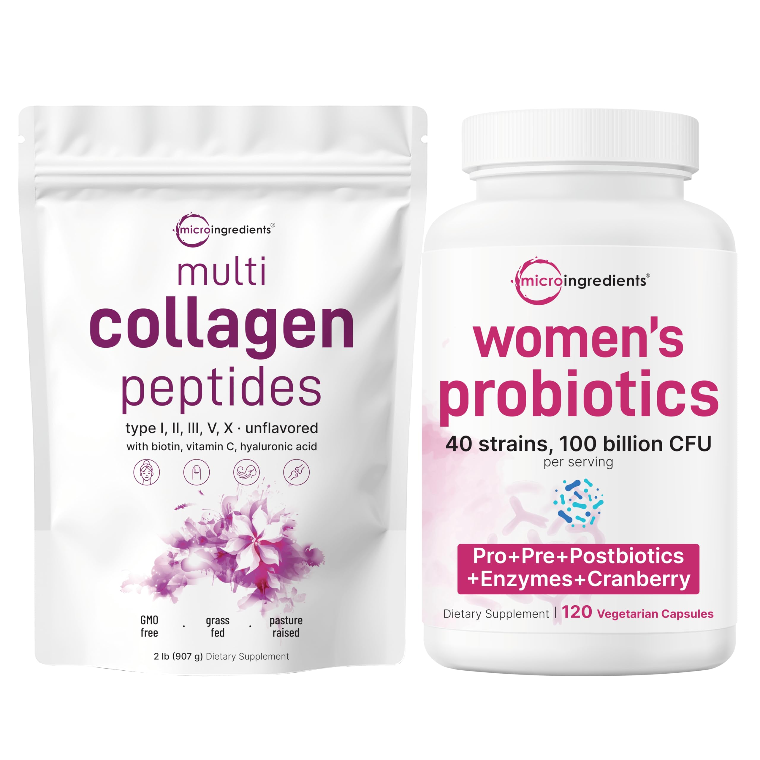 Micro Ingredients 8-in-1 Multi Collagen Powder & Women s Probiotics 100 Billion CFU Veggie Capsules | 2 Pack | Hydrolyzed Peptides + Hyaluronic Acid & Vitamin C | 40 Strains + Cranberry & D-Mannose