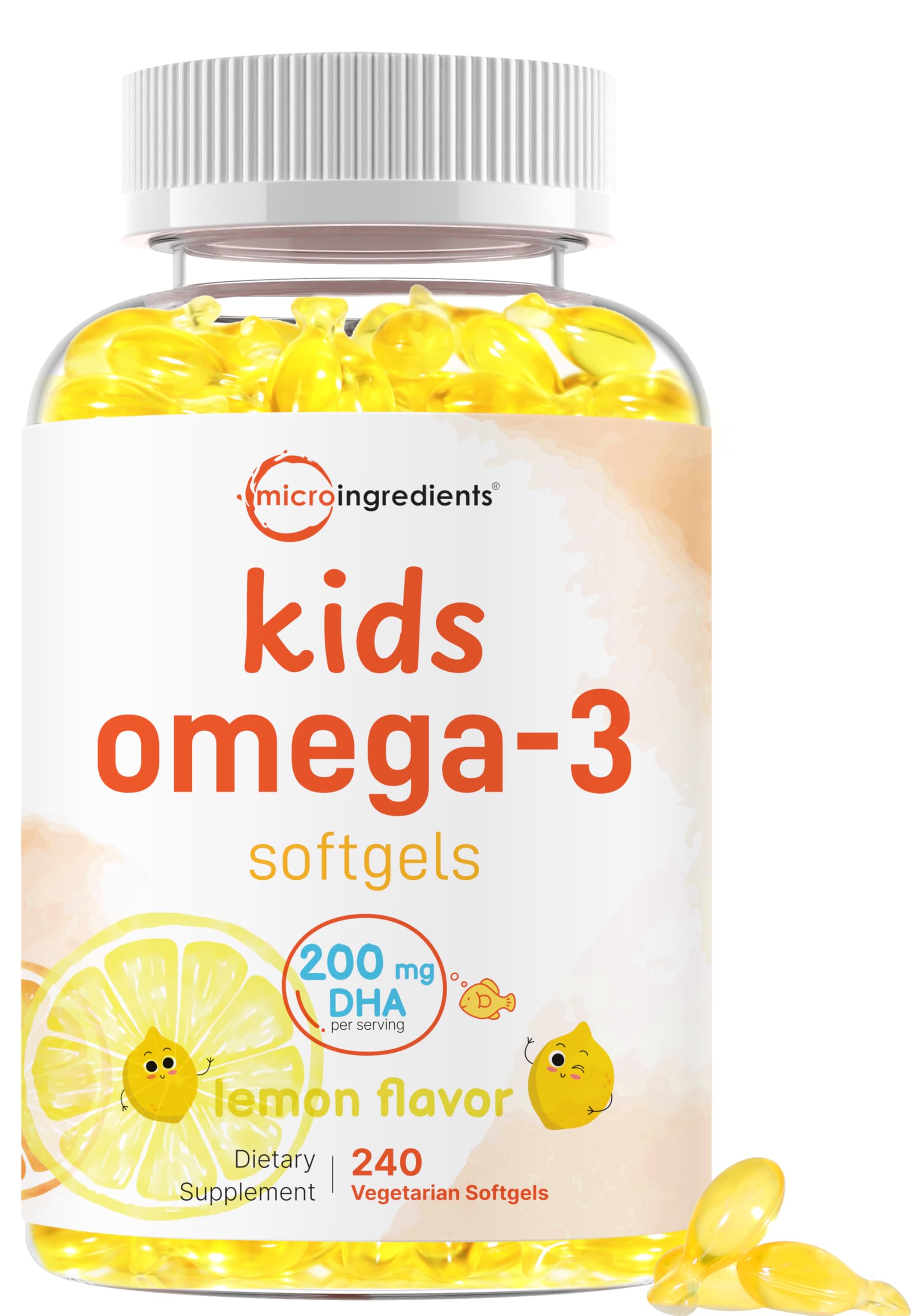 Micro Ingredients Kids Omega-3 Fish Oil 240 Veggie Softgels | Vegan Omega 3 with 200mg DHA | Lemon Flavored | Fish Oil Alternative from Algae Oil | No Fishy Smell or Aftertaste