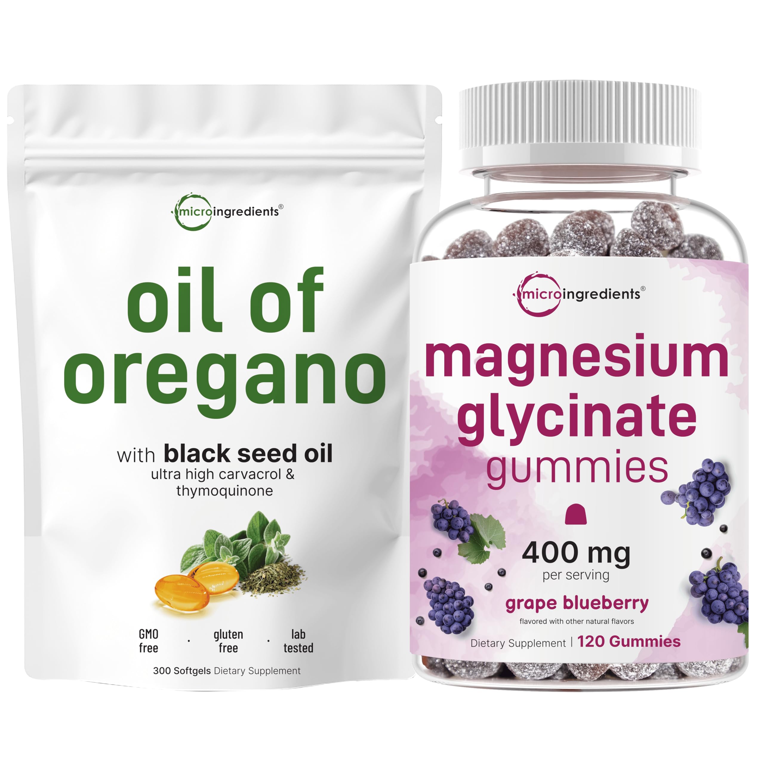 Micro Ingredients Magnesium Glycinate Gummies & Oil of Oregano Softgels | Bundle | Natural Grape Blueberry Flavor | Potent Elemental + Chelated Form | 4X Strength Carvacrol & Thymoquinone
