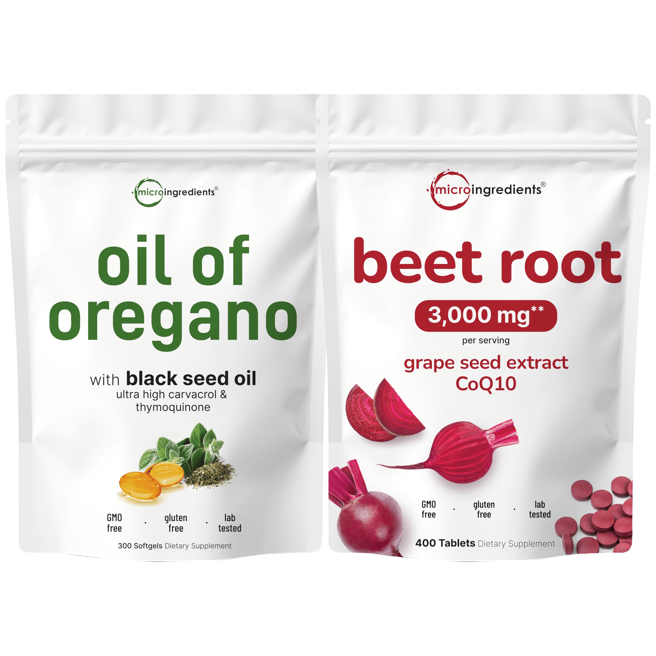 Premium non-GMO supplement. Made without soy, dairy, gluten, and tree nuts. Ingredients must pass our 3rd party lab tests to ensure a product that is safe, pure, and potent. Bundle pack health benefits include Oil of Oregano that promotes seasonal immune health and harnesses the power of nature's finest gifts, as well as the addition of grape seed extract and CoQ10 to beet root tablets offers essential antioxidants and herbal benefits that enhance nutrient flow, supporting cellular health, energy levels, and heart health. Long lasting 400 tablets per pouch. Provides a potent 3,000mg serving of beet root extract with grape seed extract and coenzyme Q10 (CoQ10) per dose. Benefit from a generous 150-day supply of freshly harvested Oil of Oregano with a powerful 165mg naturally occurring Carvacrol and the highly regarded Black Seed Oil with naturally occurring Thymoquinone. Micro Ingredients bundle pack, a fresh Oil of Oregano from Origanum minutiflorum leaves and 200mg Black Seed Oil from Nigella sativa per serving, as well as 3-in-1 max strength beet root complex. Enhanced with grape seed extract and coQ10 for optimal nitric oxide support. Retains essential antioxidants, betaine, and flavonoids.