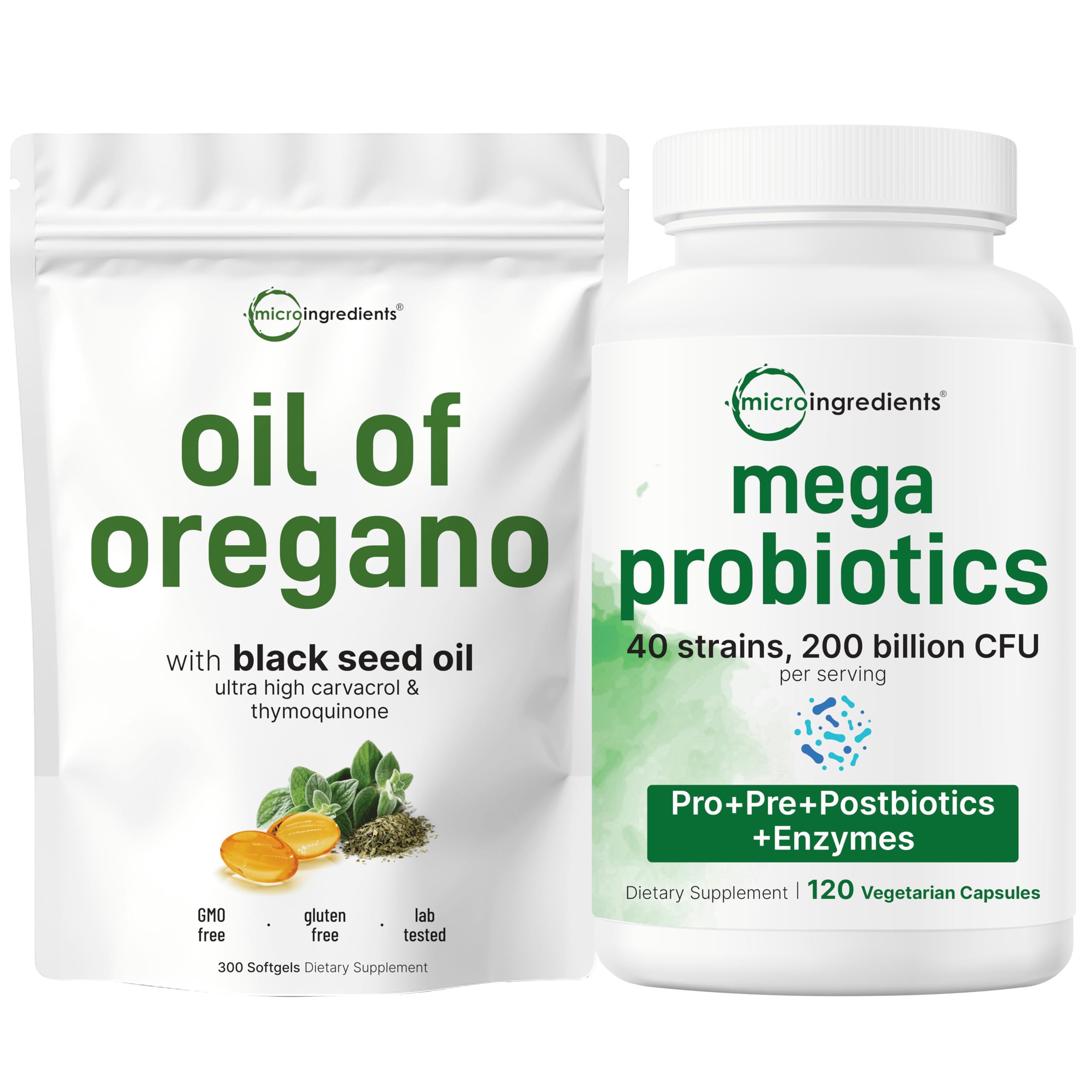 Micro Ingredients Oil of Oregano Softgels & Mega Probiotics 200 Billion CFU Veggie Capsules | 2 Pack Bundle | 4X Strength Thymoquinone + Black Seed | 40 Strains + Inulin Acacia & Bromelain