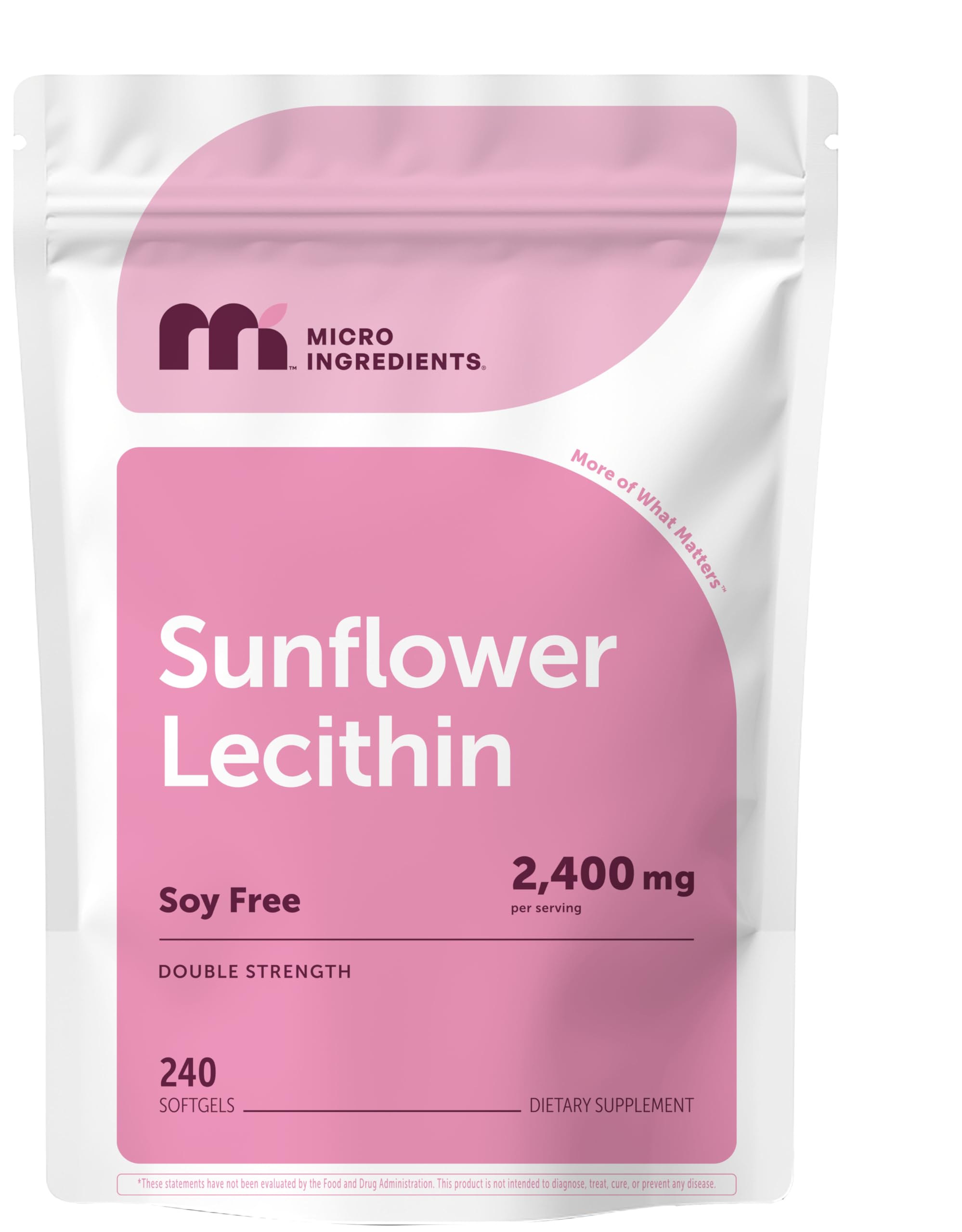 These statements have not been evaluated by the FDA. This product is not intended to diagnose, treat, cure, or prevent any disease. Sunflower lecithin supplement made with premium non-GMO ingredients in a cGMP compliant facility and free from soy, dairy, gluten and tree nuts. Third-party lab tested for safety, purity, and potency. A daily phospholipid supplement for women and men, carefully designed in an easy-to-swallow softgel form for consistent use and simple daily enjoyment. These softgels provide a convenient soy-free sunflower lecithin option, offering an easy alternative to powders without the need for mixing or added preparation. Each pouch provides 240 softgels, offering 80 servings. Every serving of 3 softgels delivers 2,400mg sunflower lecithin, including 360mg of naturally occurring phosphatidylcholine. Micro Ingredients offers a double strength, soy-free Sunflower Lecithin softgel supplement made with trusted plant-derived ingredients sourced from authentic sunflower seeds.