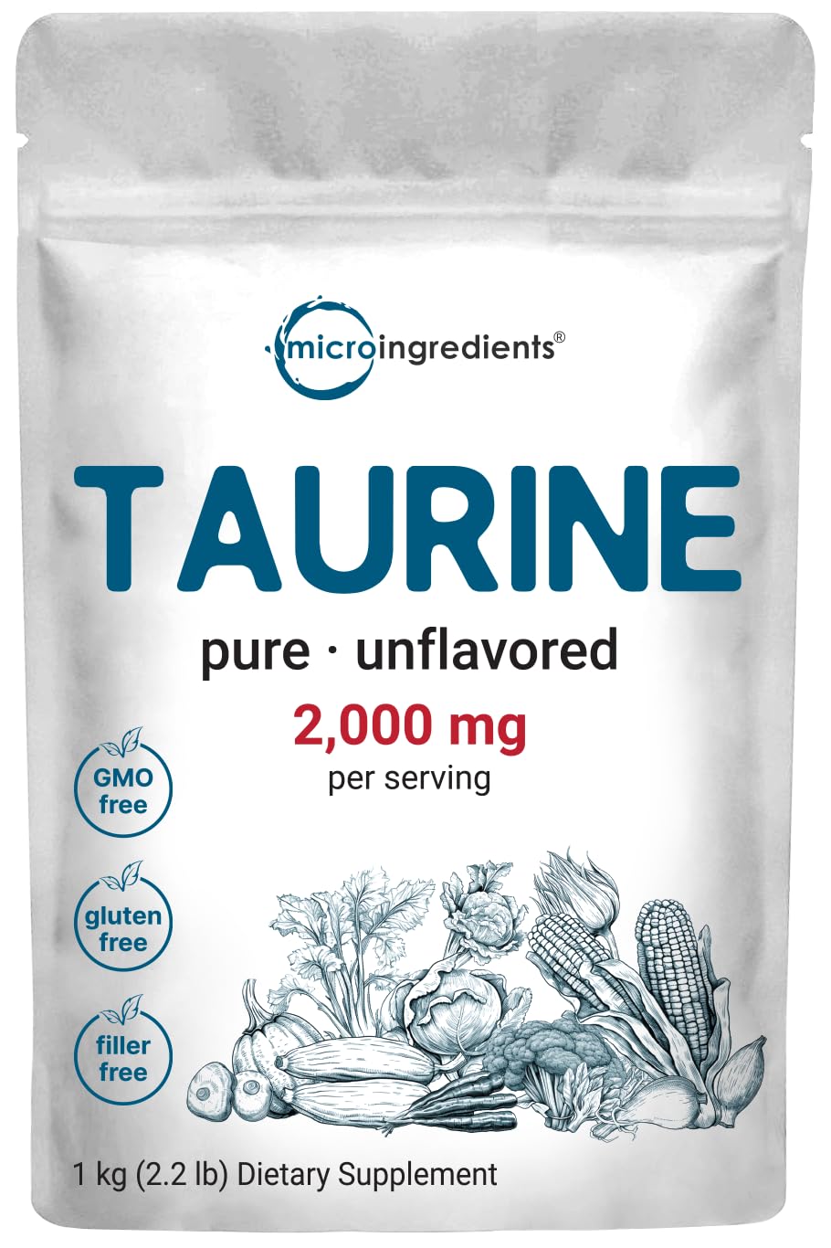 Premium non-GMO taurine supplements. Made without soy, dairy, gluten, fillers, preservatives, flavors, and tree nuts. Ingredients must pass our 3rd party lab tests to ensure a product that is safe, pure, and potent. Free forming amino acids are unbound and allow for more efficient absorption, great for any pre or post workout drinks, add to any beverage and you won't even know it is there. Taking daily will promote natural amino acid properties for supporting ant-aging benefits towards heart health, workout performance, and sustainable energy production in both men and women. Each pouch provides 1kg (2.2lbs) of pure taurine powder, 1 scoop serving size that equals a 2,000mg dose, over a 16-month supply. Micro Ingredients offers a bulk 2.2 pound supply of unadulterated taurine powder, no artificial colors or flavors added, easily absorbed free form, conditionally essential amino acid support.