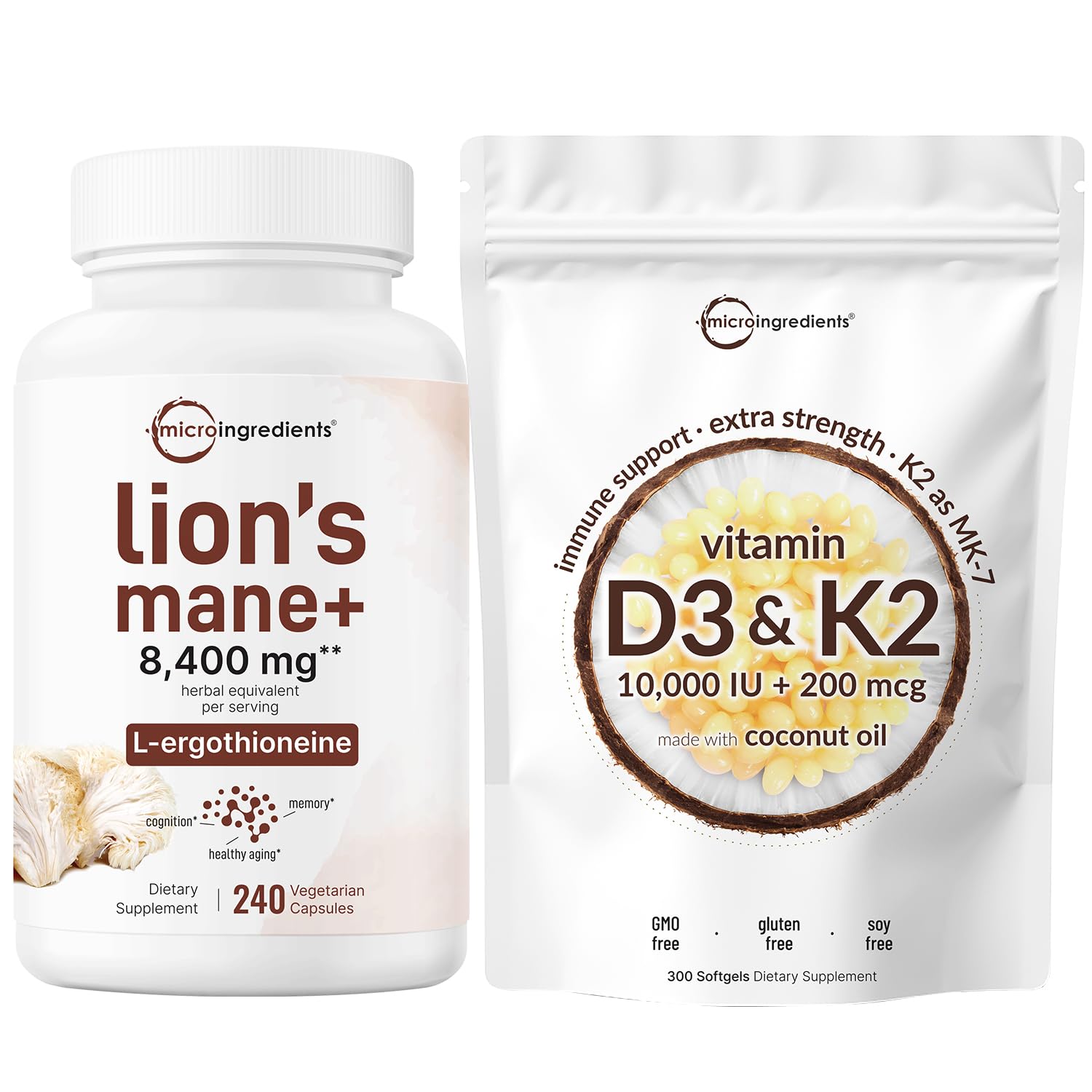 Premium non-GMO ingredients. Made without soy, dairy, gluten, preservatives, flavors, and peanuts. Ingredients must pass our 3rd party lab tests to ensure a product that is safe, pure, and potent. Bundle pack health benefits include D3K2 promoting calcium absorption for heart, joint, teeth, and bone health, as well as antioxidants for supporting focus and memory, and healthy aging properties for men and women. Each bottle of Lions Mane Supplement contains 240 vegetarian capsules, 2 veg capsules serving size provides 8,400 mg lion's mane herbal equivalent and 5 mcg L-ergothioneine, 120 total servings. Vitamin D3 10,000iu with K2 200 mcg per serving, 300 softgels infused with coconut oil for max absorption, long lasting 10-month supply. Micro Ingredients bundle pack, vitamin D3 K2 coconut oil softgels with D3 as cholecalciferol and K2 in its top-grade MK-7 form, high concentrated 2-in-1 lion's mane veggie capsules with L-ergothioneine, a real 15:1 extract from entire fruiting body and mycelium mushrooms.