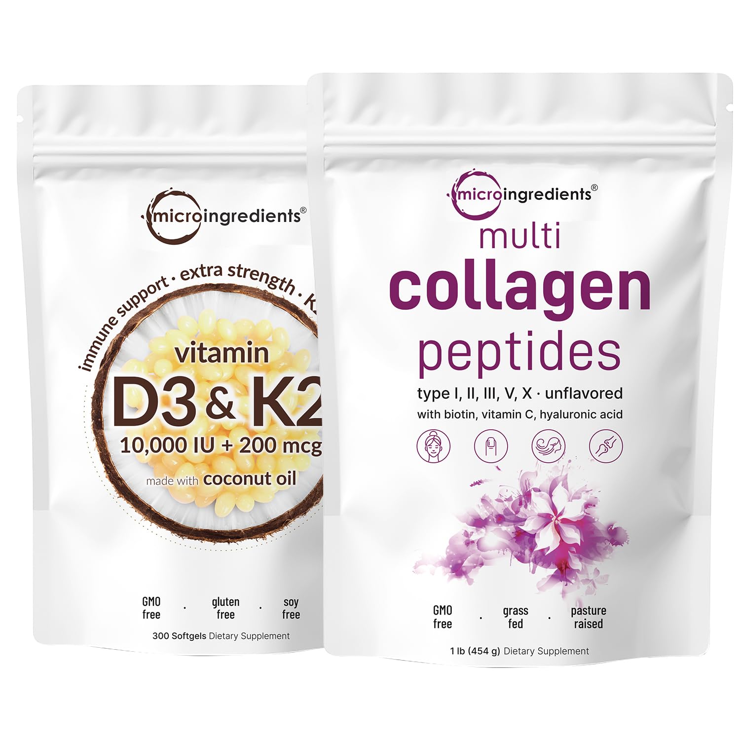 Age related issues are something the affects everybody. We start to notice thin hair, dry skin, achy joints, and unhealthy nails. This is all related to collagen. Collagen is a type of protein that is naturally produced in the body and makes up the structure of components like cells, connective tissue, skin, joints, bones, and hair. Vitamins D3 and K2 are meant to be taken together, this combination creates synergy within the body to support calcium absorption, immune defense, bone strength, and heart health. They are considered fat-soluble vitamins and require the presence of fat to be best absorbed.Premium non-GMO ingredients. Made without soy, dairy, gluten, preservatives, flavors, and peanuts. Ingredients must pass our 3rd party lab tests to ensure a product that is safe, pure, and potent. Bundle pack health benefits include D3K2 promoting calcium absorption for heart, joint, teeth, and bone health, as well as the multi collagen complex nourishing the hair, skin, and nails. 1 pound (16oz) supply of multi collagen powder, 11g collagen complex from bovine, fish, chicken, and eggshell membrane, with 2,500mcg biotin, 55mg vitamin C, and 55mg hyaluronic acid per serving, 41 total servings. Vitamin D3 10,000iu with K2 200 mcg per serving, 300 softgels infused with coconut oil for max absorption, long lasting 10-month supply. Micro Ingredients bundle pack, vitamin D3 K2 coconut oil softgels with D3 as cholecalciferol and K2 in its top-grade MK-7 form, 8 in 1 hydrolyzed collagen peptides powder, includes types I, II, III, V, and X.