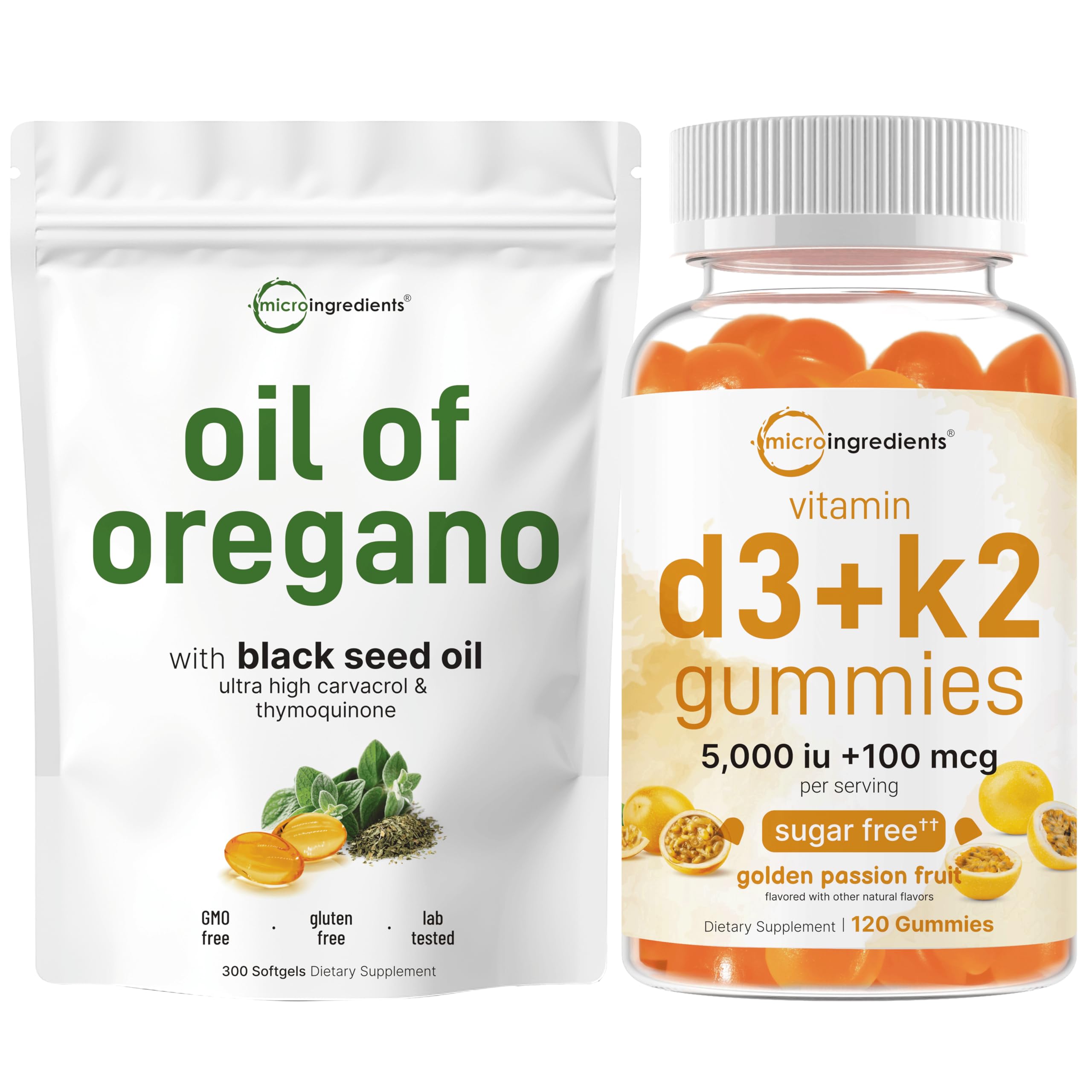 Micro Ingredients Vitamin D3 K2 Gummies & Oil of Oregano Softgels | Bundle | Sugar-Free Golden Passion Fruit Flavor | 5 000 IU D3 + 100 mcg K2 MK-7 | 4X Strength Carvacrol & Thymoquinone