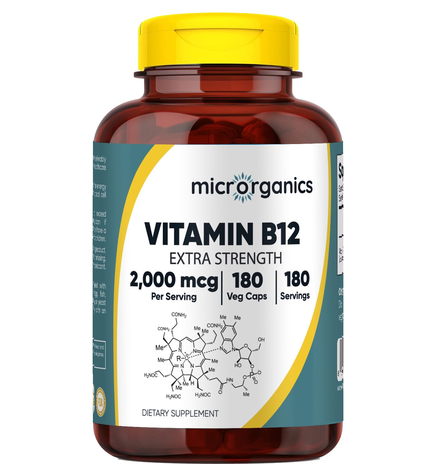 MICRORGANICS Vitamin B12 2 000 mcg Extra Strength Energy Focus & Nervous System Support Cyanocobalamin Form 180 Vegan Capsules 180 Servings