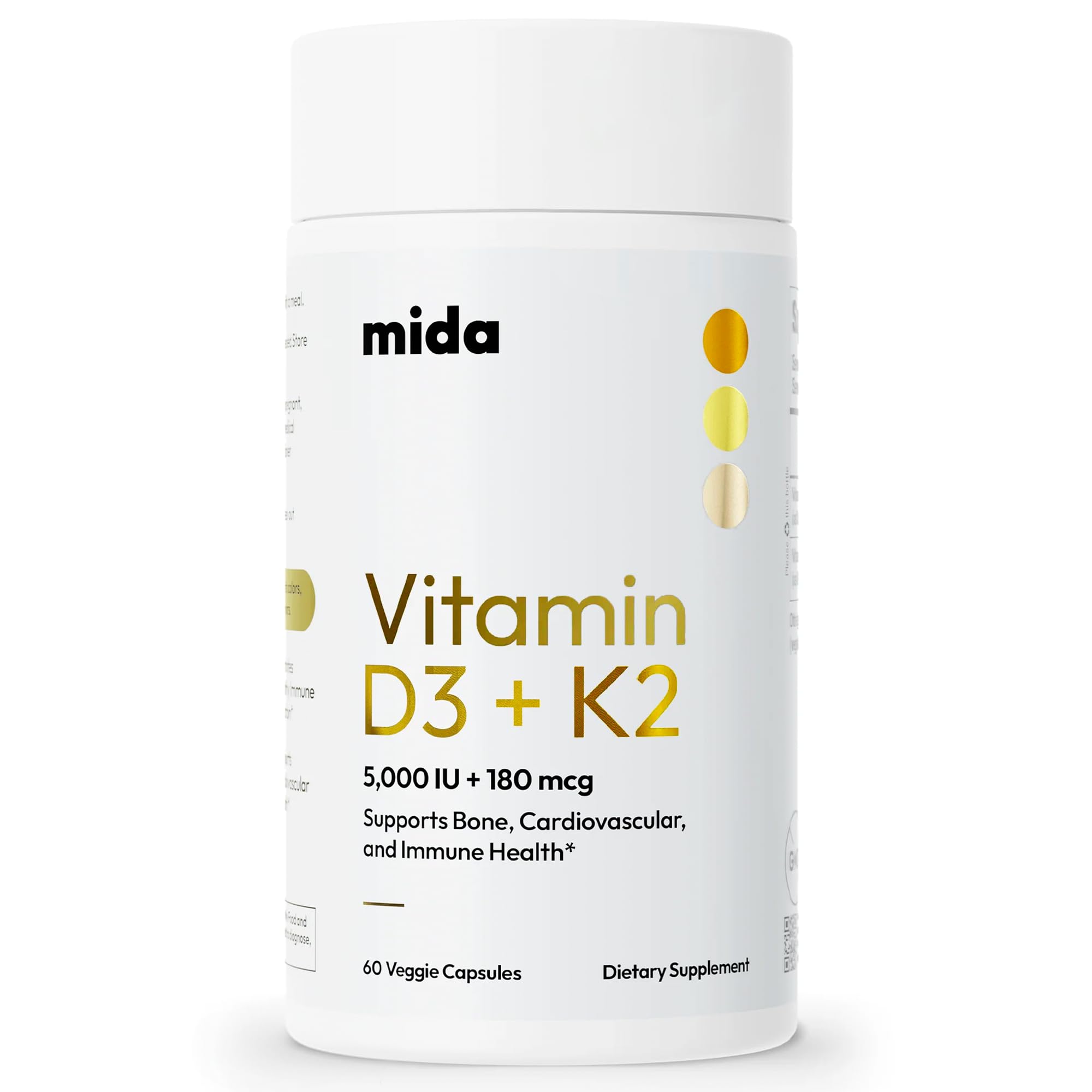 Mida Health Vitamin D3 K2 5000 IU with MK7 (125 mcg) | Natural Supplement for Bone Strength Heart Health and Immune Support | Vegan Capsule | 60 Servings