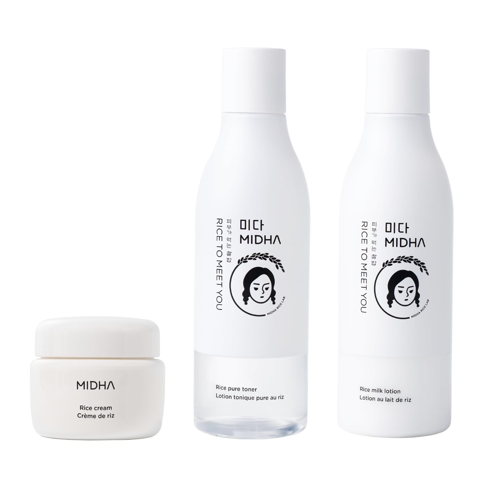 MIDHA Rice Cream 1.69fl.oz. + Rice Sebum Toner 6.76fl.oz. + Rice Milk Lotion 6.76fl.oz. Skin Barrier Support Moisturising Lightweight Daily Cream with Dewy Pore Refining Sebum Control Lightwei