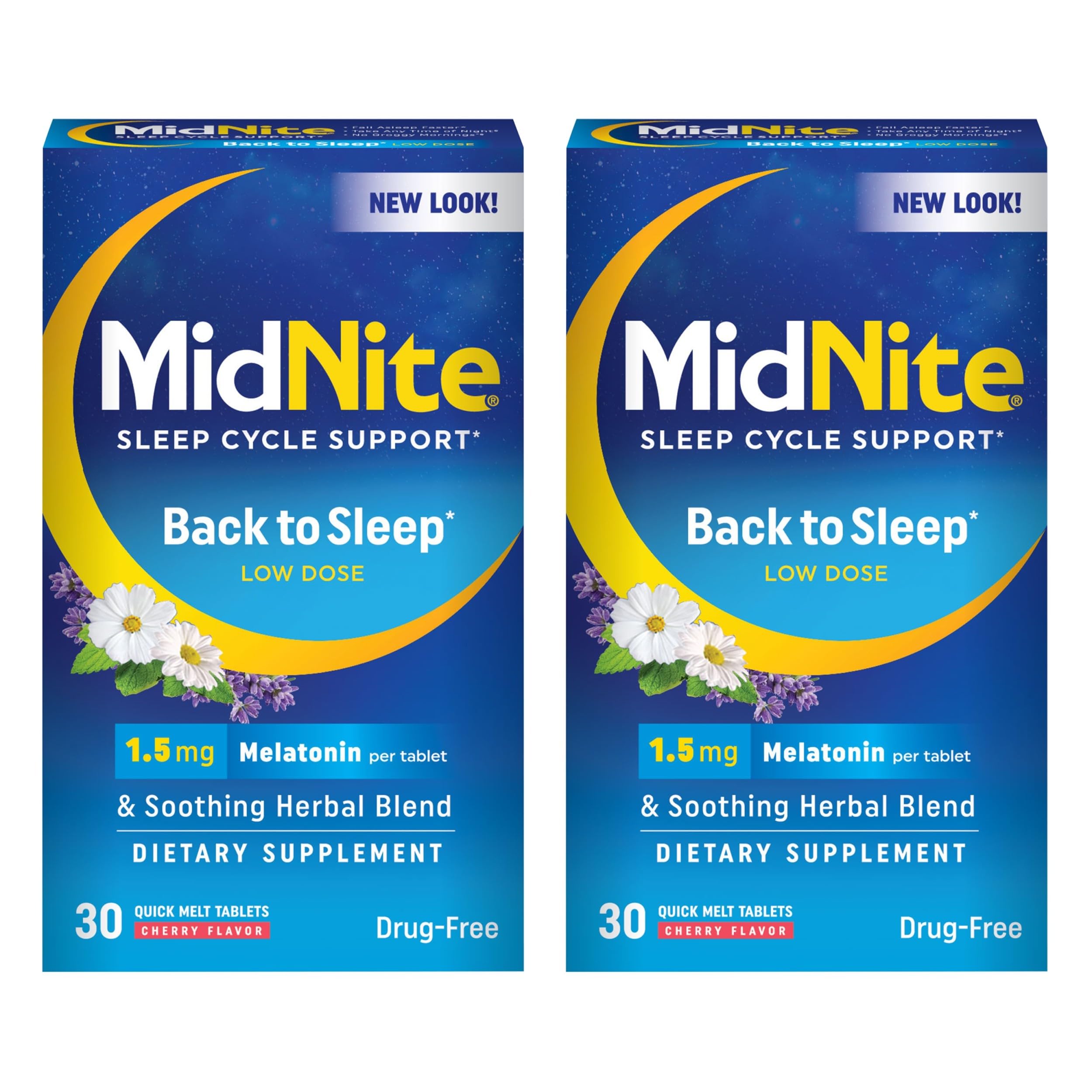 Fall asleep faster with MidNite! A drug-free dietary supplement, MidNite Back to Sleep Low Dose melatonin sleep aid is for adults 18 and over who suffer from occasional sleeplessness. Soothing and effective, it contains 1.5 mg of melatonin to help activate your natural sleep-wake cycle and our natural botanical blend of lemon balm, chamomile, and lavender to promote relaxation and sleep. MidNite Low Dose cherry-flavored quick melt tablets provide a dose of melatonin to help you fall asleep faster and wake up refreshed, not groggy. Non-habit forming, MidNight Low Dose is drug-free, gluten-free, lactose-free, vegetarian, and vegan. It can be taken at any time of the night (please allow for at least 3 hours of sleep after taking) and wake refreshed, with no grogginess. Not intended for long-term or continuous use. These statements have not been evaluated by the Food and Drug Administration. This product is not intended to diagnose, treat, cure, or prevent any disease.