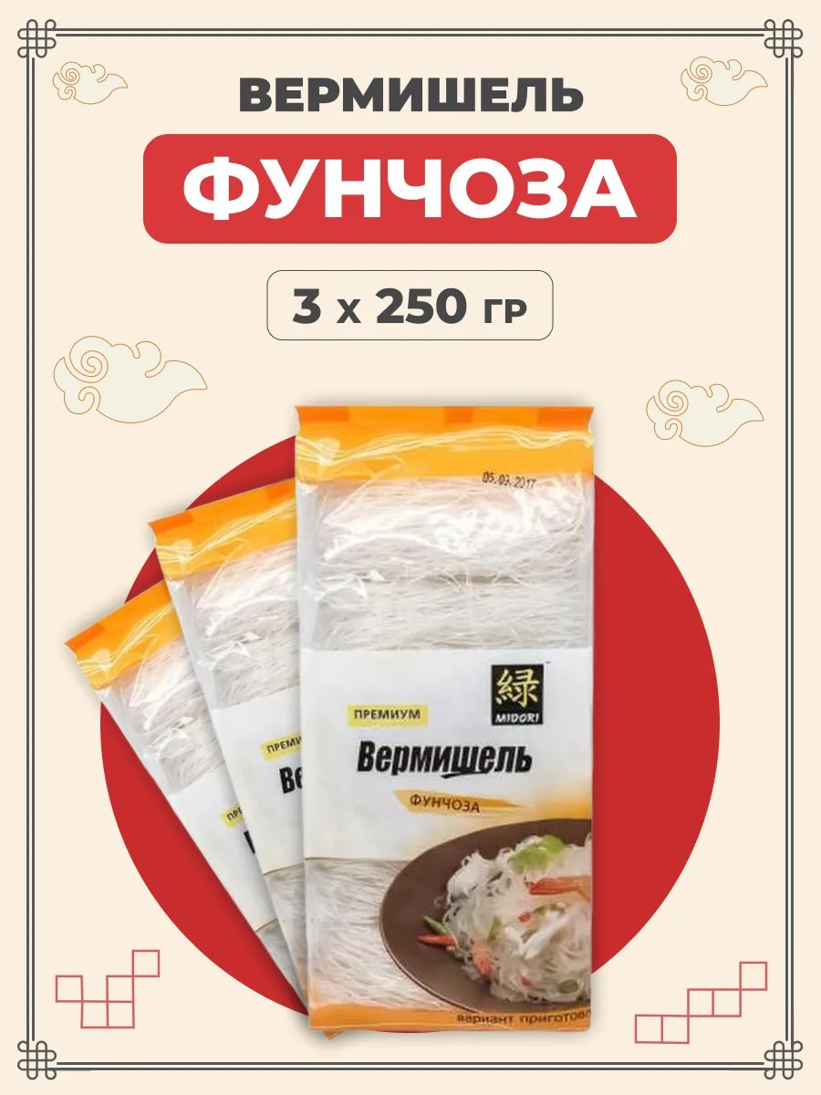 Midori Фунчоза лапша бобовая 250 гр, она же стеклянная, хрустальная, ледяная лапша, представляет собой тонкую вермишель, произведенную из бобовой муки. Бобовая вермишель Фунчоза прекрасно сочетается с овощами и мясом в горячих блюдах и супах, а так же является основой для знаменитого салата по-корейски Фунчоза - это азиатская еда. Создана вермишель бобовая из натуральных ингредиентов: перемолотого в муку гороха, фасоли, кукурузного крахмала и воды. Китайская лапша фунчоза Мидори, при постоянном употреблении, положительно способствует процессам пищеварения, а также нормализации микрофлоры ЖКТ. Большое количество аминокислот содействуют в образовании новых клеток и замедлению процессов старения. Вы можете выбрать комплект из необходимого количества упаковок внутри карточки. Оригинальная Midori лапша китайская Фунчоза исключает наличие в составе некачественных компонентов. Пожалуйста, не стесняйтесь оставлять отзывы! Мы очень внимательно относимся к качеству товаров и обязательно дадим вам обратную связь.