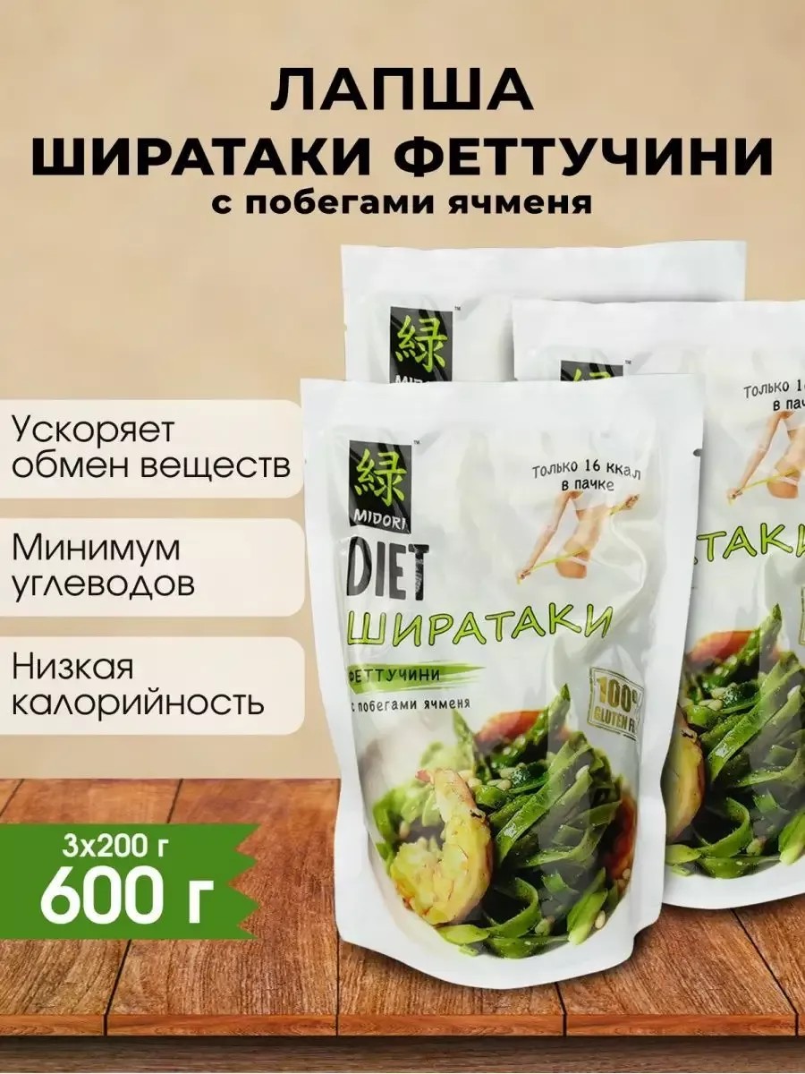 | Комплектация | Лапша Ширатаки феттуччине с побегами ячменя, 200 г - 3 шт |