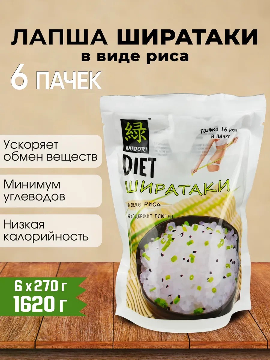 | Комплектация | Лапша Ширатаки в виде риса, 270 г - 6 шт (1620 г) |