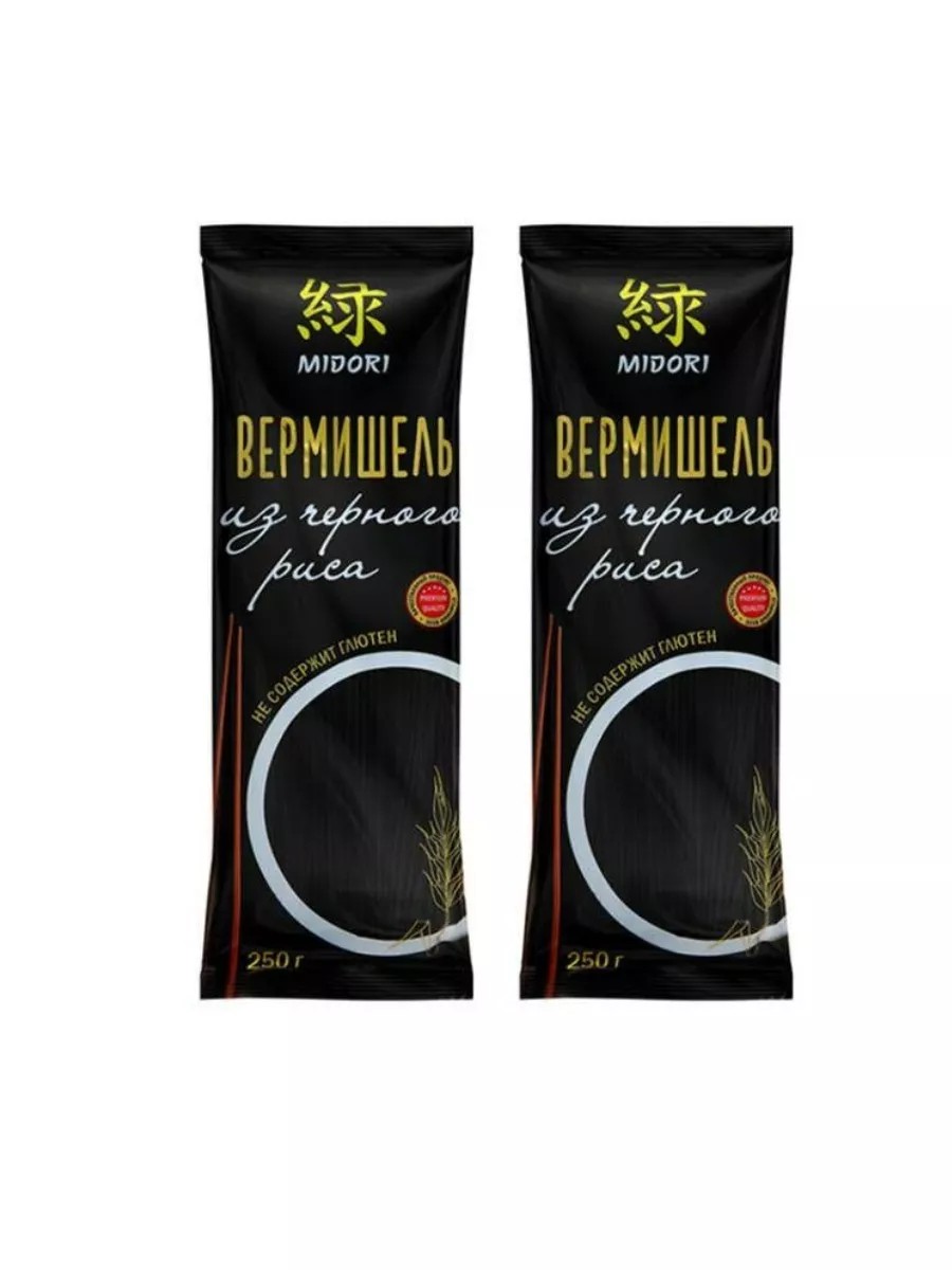 Вермишель из черного риса Мидори, 250 гр, 2 шт. Вермишель из черного риса от Midori содержит огромное количество белка, минералов и витаминов групп В и Е. Лапша идеально дополнит множество как азиатских блюд, так и европейских.Состав: мука из черного риса, мука из белого риса, вода питьевая.Пищевая и энергетическая ценность на 100 г продукта: 340 ккал, белки 10 г, жиры 1,1 г, углеводы 72,4 г.Срок годности: 36 месяцев.