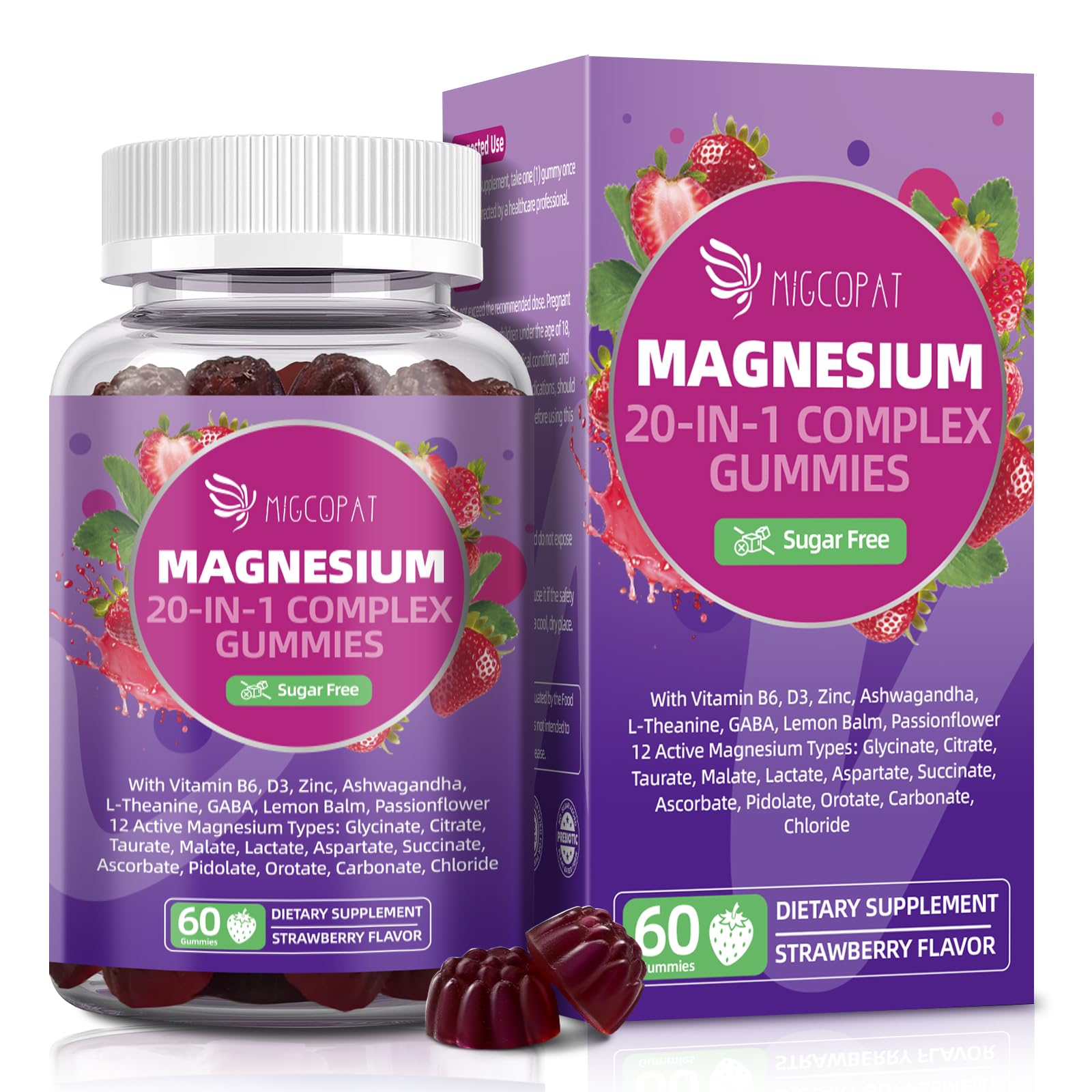 Migcopat Magnesium Complex Gummies, 20 in 1 Magnesium Gummy with Glycinate Citrate Malate Taurate - Ashwagandha, L-Theanine, D3&Zinc for Relaxation, Sleep, Muscle&Heart Support, Strawberry, 60 Cts