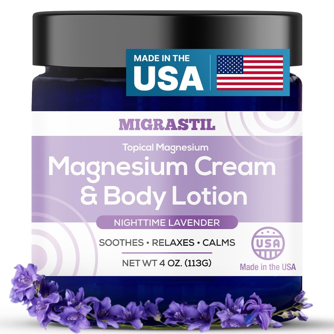 MIGRASTIL Nighttime Lavender Magnesium Cream & Non-Greasy Body Lotion. Extra Strength 250mg Magnesium Chloride for Muscle Relief Leg Cramps Relaxation and Sweet Sleep. Vegan Made in the USA. Lavender 4 Fl Oz (Pack of 1)