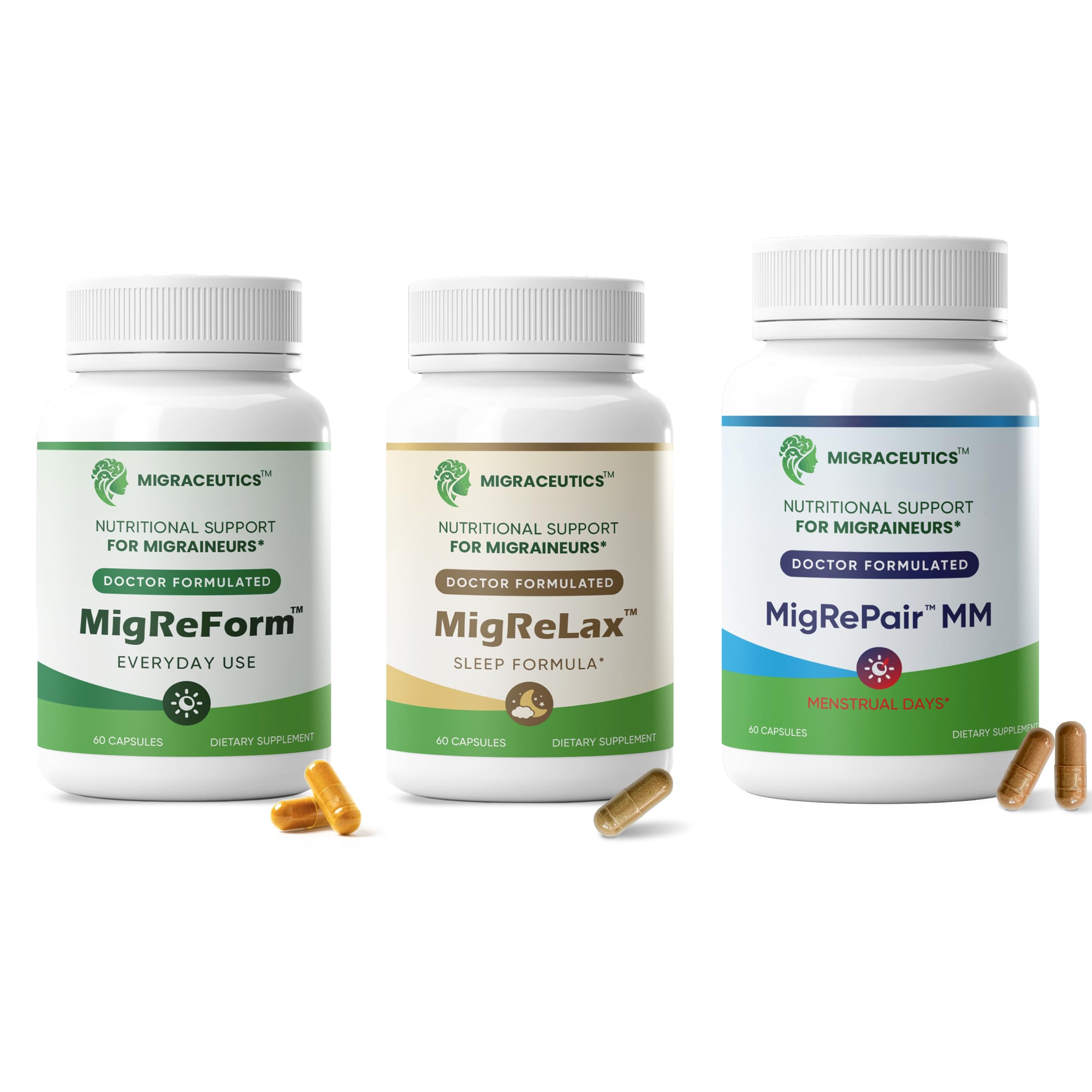 Migraceutics offers a complete, migraine-phase specific system for migraine relief through its three synergistic formulations: MigReForm, MigReLax, and MigRePair MM. MigReForm provides comprehensive migraine relief support across the ictal (migraine headache attack) and interictal (between attacks) phases using high-potency ingredients. Its proprietary magnesium glycinate related blend offers greater bioavailability than magnesium oxide, promoting optimal nerve and muscle function. Vitamin B2 helps reduce migraine frequency, while active-form B6 (P5P) supports neurotransmitter balance. HydroQSorb CoQ10, with 18 times the absorption of standard CoQ10, enhances cellular energy, and zinc citrate contributes to immune and neurological health. MigReForm is safe for everyday migraine relief support by both men and women. Talk to your neurologist about adding natural migraine supplements to your migraine medication regime and migraine prevention efforts. MigReLax is a sleep aid supplement that complements MigReForm with a calming herbal formula designed to help improve sleep quality and reduce neurological overstimulation — two critical aspects of your migraine prevention efforts. Featuring valerian, lemon balm, passionflower, and hops, MigReLax supports relaxation, neural pathway stability, and circadian balance without sleeping pills. Its ingredients address one of the most common migraine triggers: sleep disruption. For women, MigRePair MM provides natural, hormone-specific support for menstrual and hormonal migraines. Formulated by a female doctor, it combines feverfew, pine bark, grape seed, ginger, and willow bark to promote vascular health, regulate inflammation, and stabilize sensory thresholds, and support menstrual cramp relief during migraine by targeting prostaglandin balance, oxidative stress, and estrogen-related changes. Talk to your neurologist about how you can incorporate Migraceutics into your migraine prevention regimen with your migraine medications.Quality You Can Trust: Made in the USA in cGMP-certified, FDA-registered facilities. Third-party tested for purity and safety. Migraceutics donates 15 of proceeds to Physicians Anonymous (501c3) for physician mental health. Natural, Melatonin-Free Relaxation: MigReLax herbal complex with valerian, lemon balm, passion flower, and hops promotes calm, tension relief, and restorative sleep, without melatonin, caffeine, or stimulants. Scientifically Developed by Experts: Created by a female doctor with decades of migraine-focused research. Each formula includes evidence-based nutrients and botanicals for neurological, hormonal, and vascular balance. Works Across the Migraine Cycle: Bundle includes MigReForm for daily protection, MigRePair MM for menstrual and hormonal migraine phases, and MigReLax for relaxation and sleep support, comprehensive care for all migraine stages. Female-Focused Migraine Support: Doctor-formulated, USPTO patent-pending 3-bottle migraine supplement bundle designed for women's migraine wellness and hormonal balance. Supports menstrual, stress, and sleep-related migraine triggers.