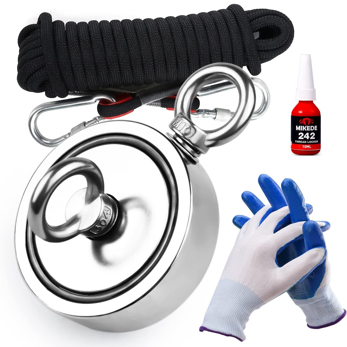 ?Satisfaction Guaranteed?- Made under ISO 9001 Quality Systems. 100% NO RISK Money Back Guarantee and friendly customer service. Any question please contact us freely. REFUND and REPLACEMENT will be offered with no question asked. ?Multi Use Neodymium Magnets Fishing? - Not only can you use our neodymium retrieving magnet for discovering lost treasures underwater, you can also use our magnet fishing to help suspend everyday items up in the air. Great for salvaged of various iron-containning nickel material underwater and good idea for magnet fishing, lifting, hanging, retrieving applications. Have fun to searching items like eyebolt, screws, hooks, fasteners and so on in your warehouse garage or yard. ?Useful Magnetic Fishing Tools? - Diameter 8mm/0.314inch x Length 10m/33 foot high strength polyester rope included, You just need to take it and go fishing directly without anything else. And the rope has a 304 stainless steel ring with corrosion resistance at both ends, which is more convenient to use. When using salvage magnet, the protective gloves not only can effectively protect the hand from injury, but also can effectively prevent skidding by the strong friction force. ?Best Coating? - The heavy duty fishing magnet is covered in a steel plate and then coated in Ni-Cu-Ni (Nickel, Copper, Nickel), a steel cup provides protection for the magnets and helps to prevent chipping or cracking. Best quality could help you use the fishing magnet set for long. ? Fishing Magnets?- The strong fishing magnet come with two eyebolt rings and countersunk holes was designed in the middle and side of the magnet. Unique design structure make it's function more powerful. 3.7inch/94mm diameter, Double sided pulling force will up to 1700LBS(772KG) totally (each side 850lbs/386kg). Specifically designed for retrieving in river and magnetic fishing.