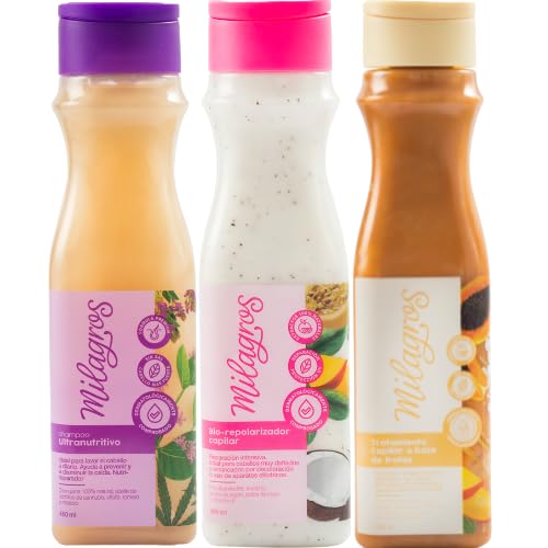 Milagro Ultranutritivo Kit of 3 Shampoo Ultranutritivo, Biorepolarizador, Mascarilla de Frutas Colombian Hair Care Products for Natural Growth, Strengthening, and Repair, 100% Natural