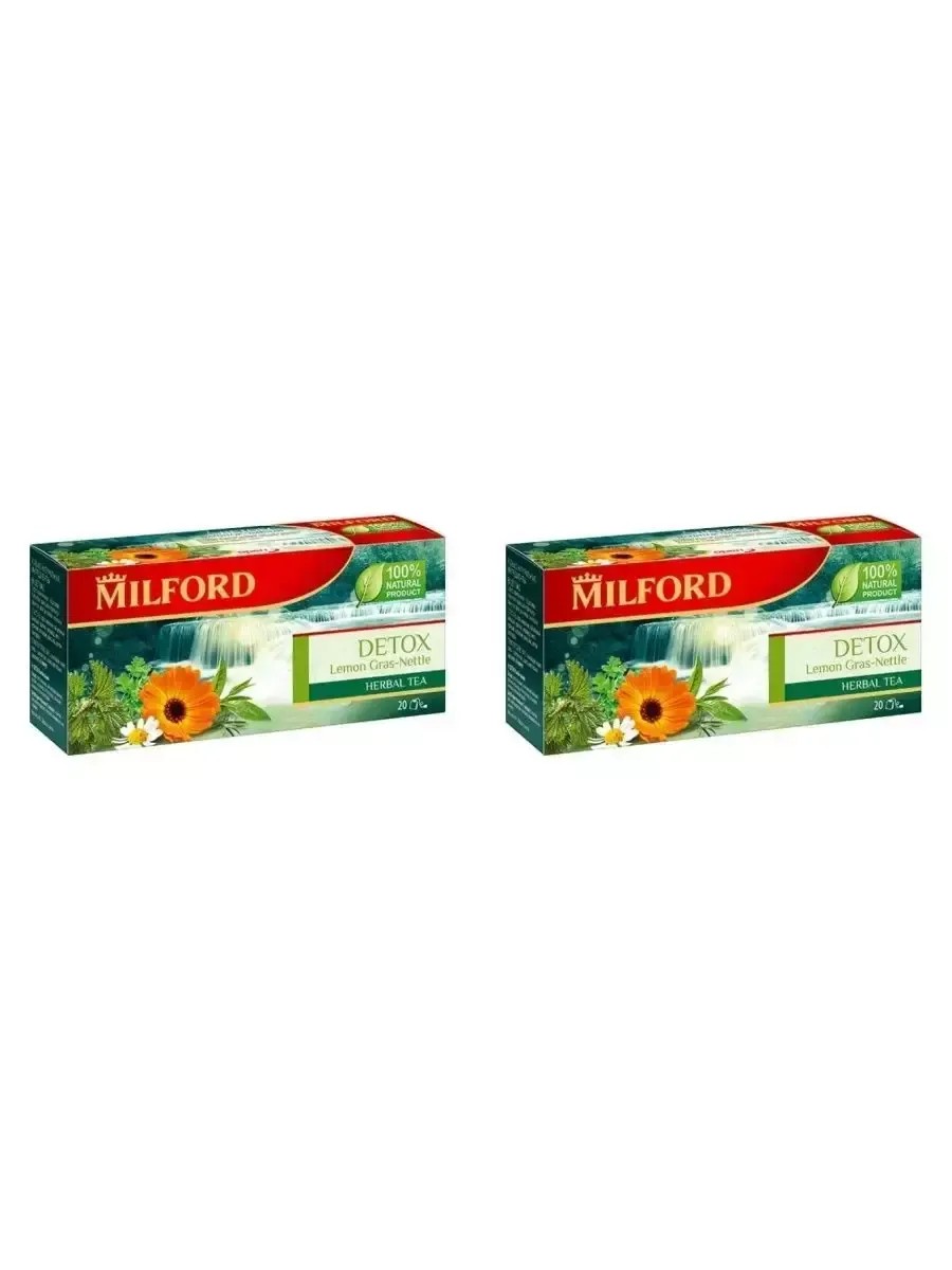 Milford Напиток чайный Детокс чай зеленый, крапива, кориандр, мята, ромашка. В комплекте 2 упаковки по 20 пакетиков. 100% натуральный продукт. Уникальная рецептура, только натуральные ингредиенты. Детокс поможет регулировать обмен веществ и улучшить пищеварение. Выведет токсины из организма, придаст энергию и бодрость. Входящая в состав крапива хорошо влияет на кровеносную систему. Календула поможет справиться с вирусами и бактериями, поможет восстановлению тканей.