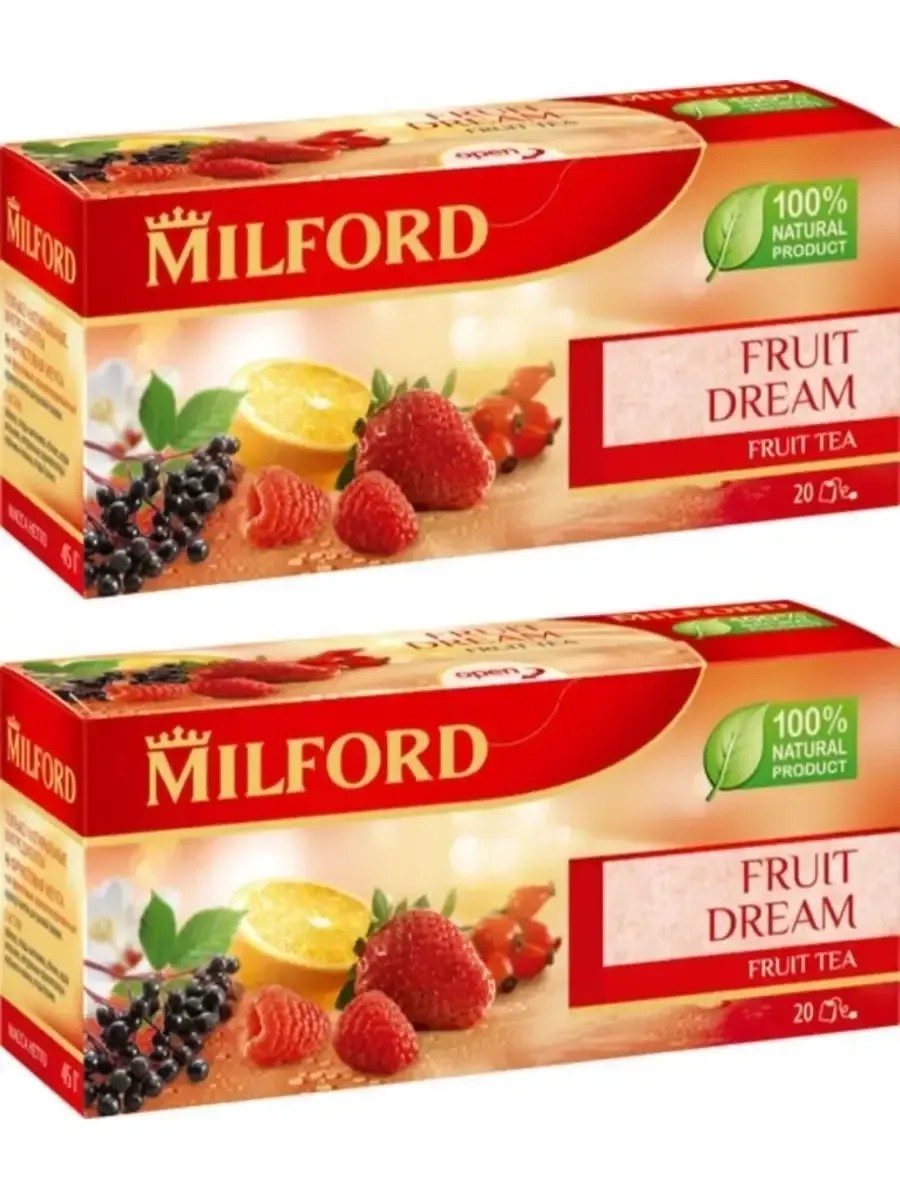Milford, Fruit dream, Травяной Фруктовая мечта чай травяной клубника, малина. В комплекте 2 упаковки по 20 пакетиков. Гармоничное сочетание плодов шиповника, яблок, апельсина, ягод бузины и гибискуса с ароматом клубники и малины — это настоящее открытие в области чая. Чай одинаково хорош как в горячем, так и холодном виде. Это не только вкусный, но и полезный напиток. Плоды шиповника богаты витамином С, а гибискус снимает усталость и насыщает организм энергией.