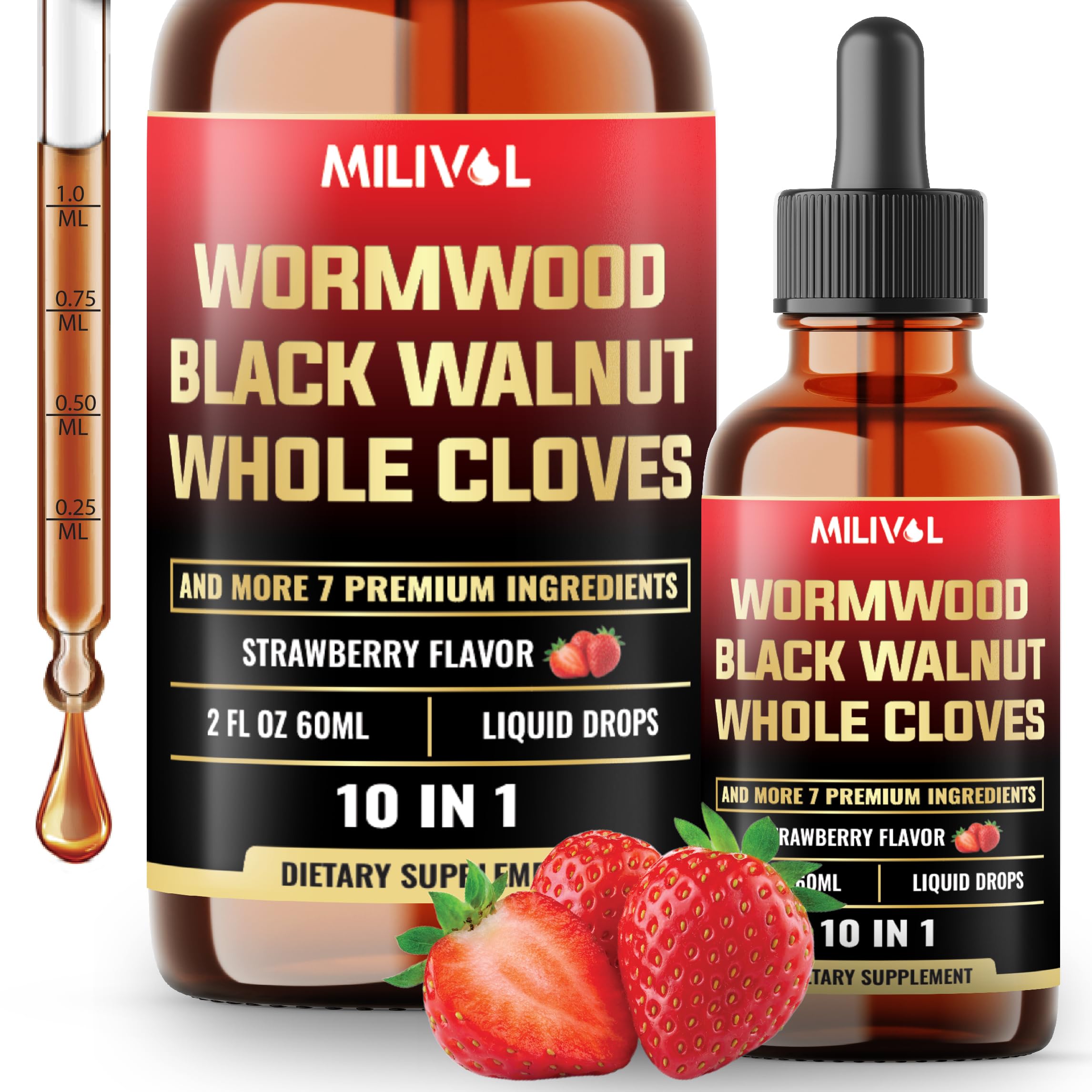 MILIVOL 10in1 Wormwood Liquid Drops with Wormwood, Black Walnut, Whole Cloves & 7 More - Support Digestive, Immune - 2 Fl Oz - 60 Days