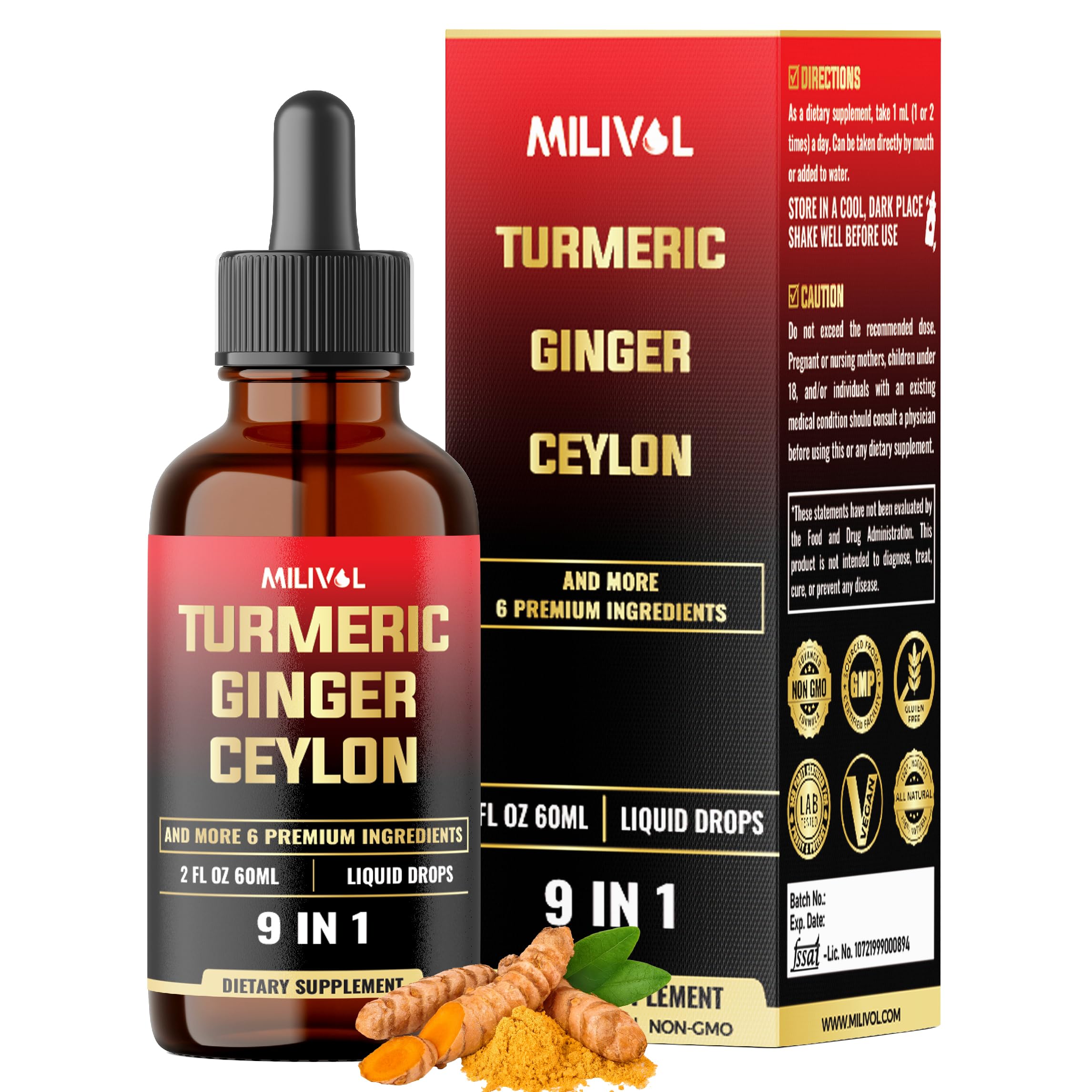 ✓ Guaranteed Satisfaction: Support your health and wellness journey. When you choose our Turmeric with Ginger Liquid Drops, you're choosing a product backed by rigorous quality standards and a commitment to excellence. ✓ Commit to Quality: Milivol is dedicated to sourcing the finest ingredients to create trusted supplements. Every batch is non-GMO and third-party tested for quality, purity, and potency, ensuring they meet the highest standards. ✓ Easy Use: Take Turmeric Ginger Liquid Drops 1ml daily. Each 60ml bottle provides a 2-month supply, easy to take directly or mix into your favorite drink. ✓ Supportive: Formulated Liquid Turmeric and Ginger Supplement to support joint mobility, immune system function, cellular protection, and digestive well-being. ✓ Overview: A potent blend of Turmeric Curcumin, Ginger, Berberine, Ceylon Cinnamon, Garlic, Black Pepper, Cayenne Pepper, Apple Cider Vinegar, and Ginseng.