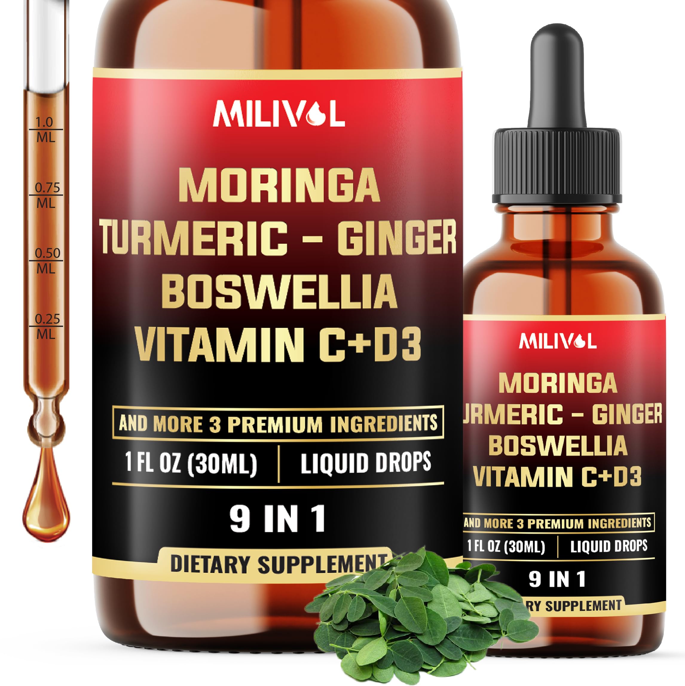 MILIVOL 9in1 Moringa Liquid Drops with Ginger Root, Ceylon Cinnamon, Ashwagandha Root, and Bitter Melon - Supplement for Women and Men - 1 FL Oz - 60 Day Supply