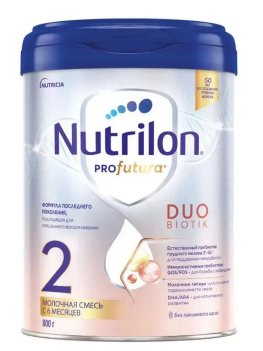 «Nutrilon Profutura DUOBIOTIK 2 закладывает основу будущего здоровья Вашего ребенка», Начало жизни вашего ребенка – особое время. Время удивительное, иногда непредсказуемое и весьма насыщенное. Это время, когда закладывается фундамент будущего здоровья малыша. И питание — важная часть этого фундамента.Вот уже более 50 лет Nutricia занимается изучением грудного молока. Вдохновлённая своими открытиями в этой области, наша команда учёных разработала уникальную формулу Nutrilon Profutura DUOBIOTIK. Эту молочную смесь можно использовать для основного или дополнительного питания. А также для плавного перехода от грудного вскармливания, если это необходимо».Nutrilon Profutura DUOBIOTIK = Нутрилон Профутура ДУОБИОТИК.Грудное молоко — лучшее питание для детей раннего возраста.50 лет исследования грудного молока.«НАША САМАЯ СОВЕРШЕННАЯ ФОРМУЛА, ПОДХОДЯЩАЯ ДЛЯ СМЕШАННОГО ВСКАРМЛИВАНИЯ»Благодаря уникальному составу, разработанная нутрициологами и иммунологами Nutrilon Profutura DUOBIOTIK 2, содержит естественный пребиотик грудного молока: 3’-GL* и иммуноактивные пребиотики GOS/FOS, помогает развитию интеллекта, поддерживает иммунную систему и способствует лучшему усвоению кальция».Уникальный микс олигосахаридов (верхний шарик)Естественный пребиотик грудного молока 3’-GL* поддерживают микробиоту кишечника.Иммуноактивные пребиотики GOS/FOS помогают противостоять инфекциям.Молочные липиды – для улучшения переносимости смеси (средний шарик)Омега-3 (DHA) и Омега-6 (ARA) полиненасыщенные жирные кислоты – для развития когнитивных функций мозга.Витамины С и D – для поддержки иммунной системы (последний шарик)3’-GL* – олигосахарид образуется в результате производства продукта по особой технологии Лактофидус с использованием молочнокислых культур.3’-GL* – естественным образом присутствует в Грудном молоке и обладает пребиотическим эффектом