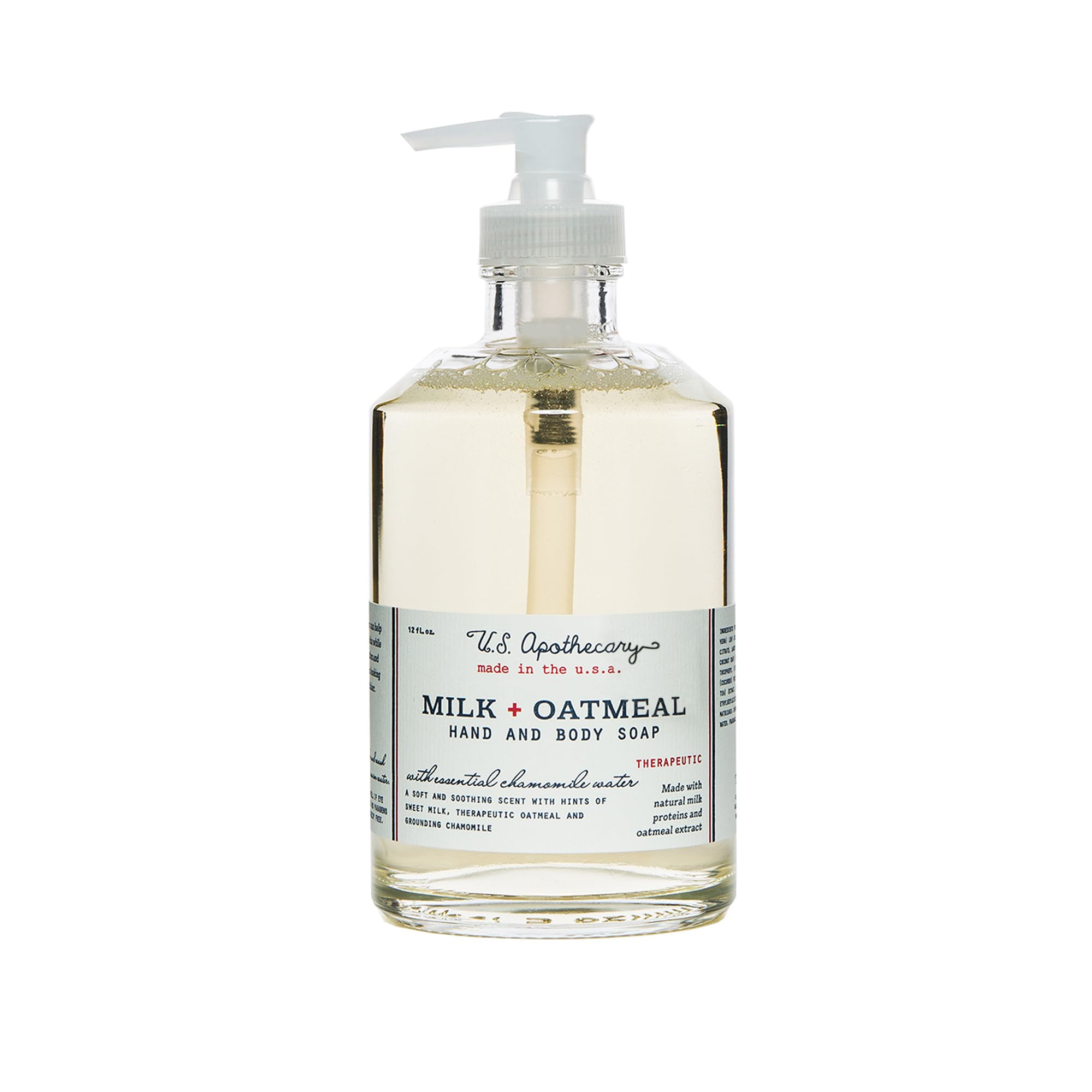 Old Homeopathic Remedies Meets Elevated Design Scents: Herbs, spices, roots and flowers are combined with botanical extracts and organic ingredients to create all of the US Apothecary lines, including home, bath and body products. Non-Drying Formula: Our liquid hand soap is moisture rich and coats the skin with protection, leaving your hands refreshed and never overdried. Light Scent: Lather your hands with this gentle and moisturizing soap to lightly scent the skin, creating an aromatic moment of bliss in your day. Great in the kitchen and bath. Plant-Based, Pure Vegetable Soap: Using natural plant extracts, our natural hand soap is made with the finest ingredients and nourishes with soothing botanicals. Creamy Sweet Liquid Soap: Made with natural milk proteins and oatmeal extract, this fragrance is a soft and serene scent with hints of sweet milk, soothing oatmeal and grounding chamomile.