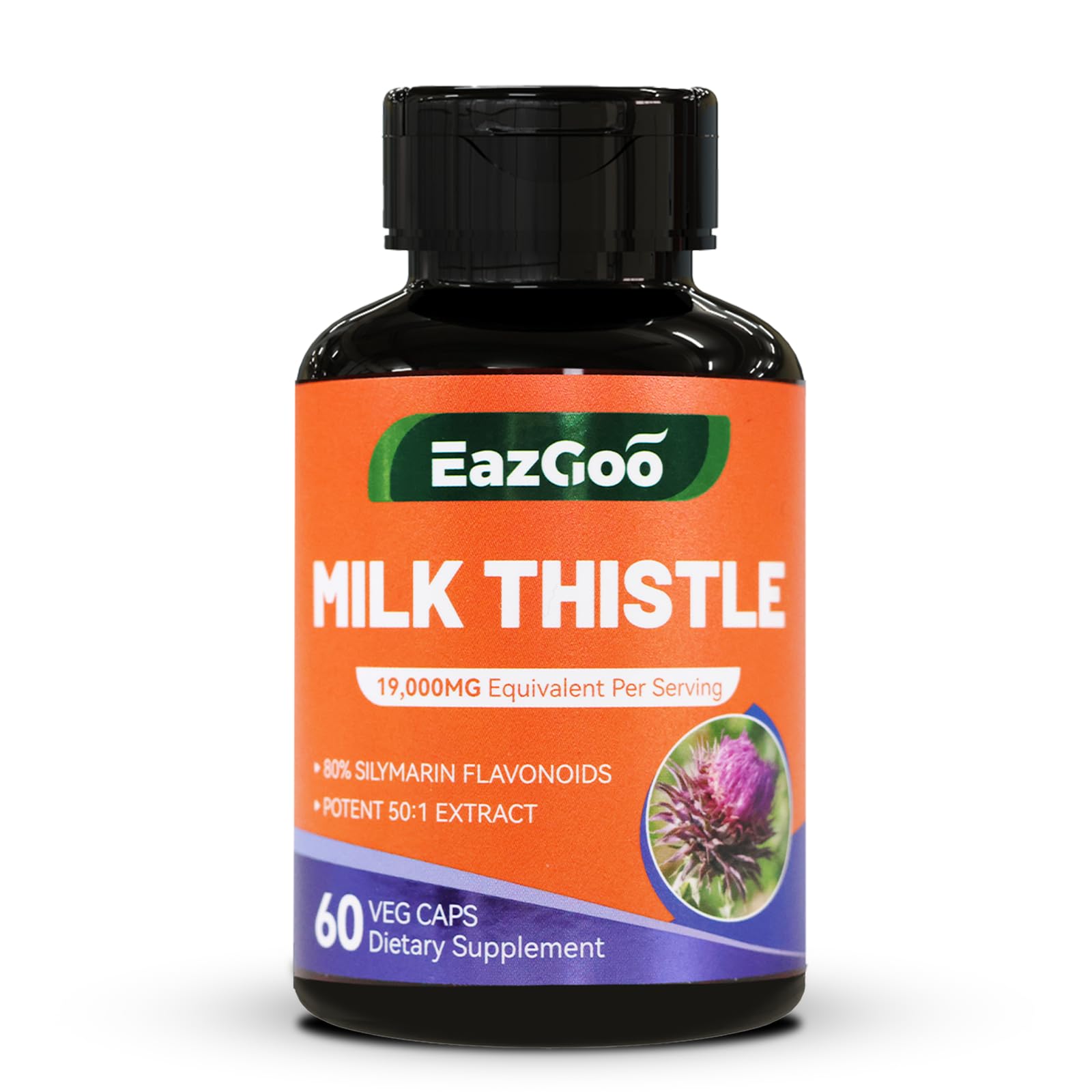 Vegan Liver Cleanse Supplement: Our capsules do not contain wheat, corn, dairy, gelatin, artificial colors, additives. EAZGOO's Milk Thistle supplement fits your health-conscious lifestyle. Liver Support Milk Thistle Extract Supplement: Each bottle contains 60 vegetarian capsules. Take 1 capsule per day for your nutritional supplement needs. Each bottle provides 2 months' supply, ensuring long-term support for your health. High Standard Manufacturing Process: Our factory has strict quality control. Obtained GMP certification. Ensure that you get the same concentration of active ingredients in each capsule. Powerful 5-in-1 Liver Support Formula: EAZGOO Milk Thistle supplement combines a potent mix of Milk Thistle Extract, Artichoke Leaf Extract, Dandelion Root Extract, Beet Root Powder, and Zinc, offering comprehensive support for liver health. High-Potency 50:1 Extract: Each capsule of our organic milk thistle supplement contains 19000 mg strength, derived from a powerful 50:1 extract, providing concentrated liver support. Each capsule provides a potent dose of milk thistle's active compounds, standardized to 80 Silymarin.