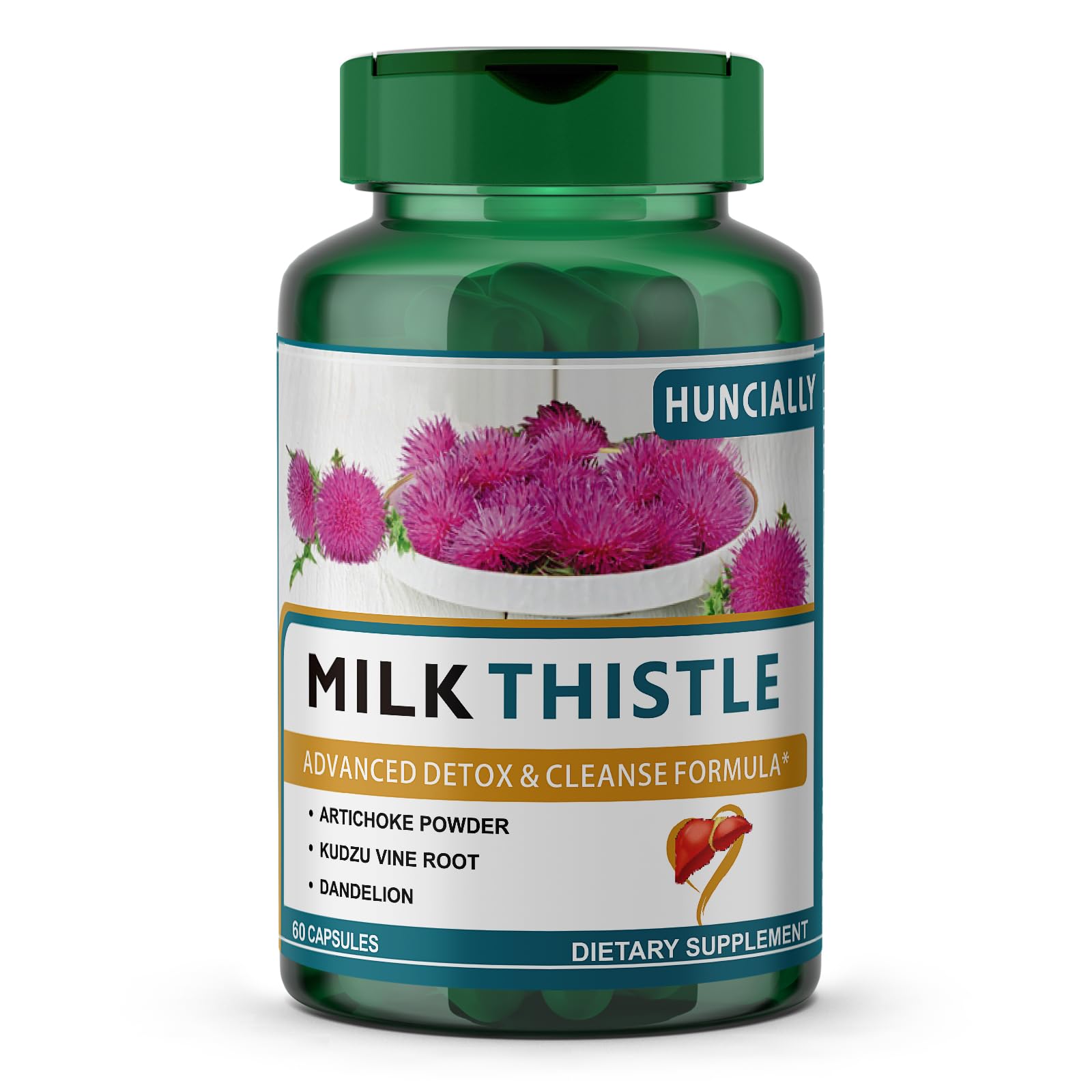 Easy-to-Take Capsules: Simply take two capsules twice daily as a dietary supplement, or as recommended by your physician, for optimal liver support and detox benefits. High-Quality Assurance: This product is produced in a GMP certified factory and meets the product's high-quality standards, ensuring premium quality and safety for every capsule. Non-GMO Gluten-Free: Made with clean, high-quality ingredients, this supplement is free from GMOs, gluten, and artificial additives, making it safe for daily use. Supports Liver Health: This formula is designed to enhance liver function, helping to remove toxins, improve digestion, and boost energy levels naturally. Advanced Detox Cleanse Formula: HUNCIALLY Milk Thistle Herbal Supplement combines powerful ingredients like Artichoke Powder, Kudzu Vine Root, and Dandelion to support liver detoxification, cleanse your body, and promote overall wellness.