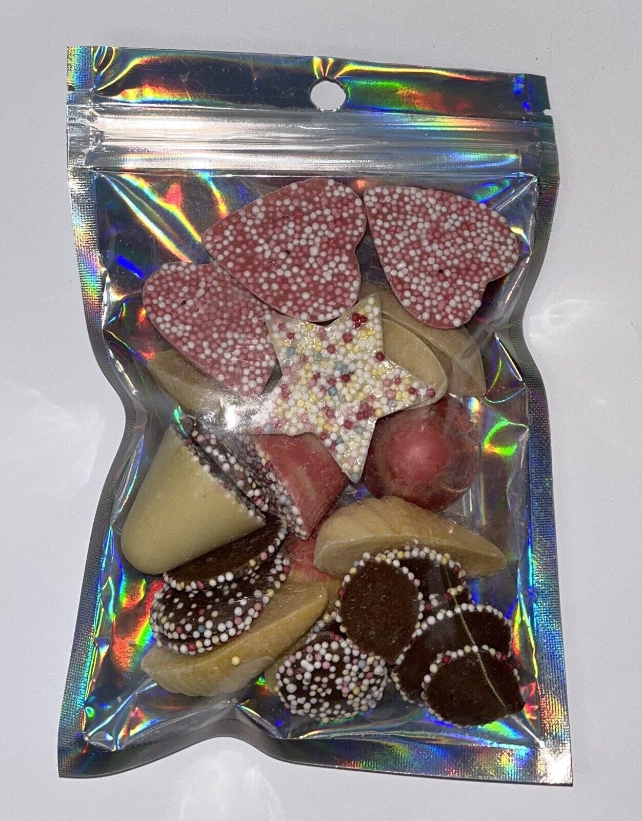The perfect gift, party favour or party bag filler - A sweet pouch full of yummy Pick N Mix style chocolate Available in 3 sizes - 100g, 300g or 650g They include a variety of milk and white chocolate hearts, stars, spinning tops, jazzies and mice A gift that can be sent directly to the recipient - please make sure the delivery address is correct at checkout If you require a party sticker - please message us after payment Please note: These sweets are assembled in an area that handles WHEAT, GLUTEN, SOYA, MILK, PEANUTS, NUTS other allergens. Not suitable for vegetarians
