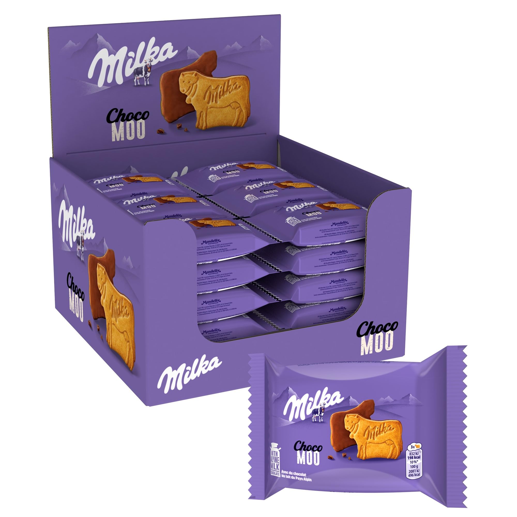 Milka Choco Moo offers an exceptional melt-in-the-mouth and intense chocolate recipe. Delicious crispy biscuit covered in Milka milk chocolate, young and old alike will melt in front of such smoothness! Take your Choco Moo everywhere with you thanks to its individual packaging and family size so you never run out! INGREDIENTS WHEAT flour, sugar, palm oil, glucose syrup, cocoa butter, skimmed MILK powder, cocoa mass, whey powder (from MILK), BUTTER, whole MILK powder, emulsifiers (SOY lecithin, E 472e, E 476), raising agents (sodium hydrogen carbonate, ammonium hydrogen carbonate), salt, HAZELNUT paste, flavorings, acidity regulator (citric acid). MAY CONTAIN EGG AND SESAME. DIRECTIONS FOR USE Ready to eat SAFETY WARNING Not suitable for children under 3 years Delivery contents: Display of 24 Milka Choco Moo packs, Net weight: 40 g pack. Convenient family size, easy to take anywhere, in your bag or to the office thanks to its individual packaging. Ideal for a small appetite at any time of the day or to share with friends during a coffee break. 100 sustainable cocoa from the Cocoa Life program for a delicious and high-quality chocolate. Delicious crispy biscuit topped with Milka chocolate made with good milk from the Alpine country. Delivery contents: Display of 24 Milka Choco Moo packs, Net weight: 40 g pack. Convenient family size, easy to take anywhere, in your bag or to the office thanks to its individual packaging. Ideal for a small appetite at any time of the day or to share with friends during a coffee break. Easy to take and slip into a handbag or school bag thanks to the practical individual packaging. Delicious crispy biscuit topped with good Milka milk chocolate. Milka Choco Moo propose une recette exceptionnelle fondante et intense en chocolat. Délicieux biscuit croustillant nappé de chocolat Milka au lait, petits comme grands fondront devant tant d'onctuosité ! Emportez votre Choco Moo partout avec vous grâce à son emballage individuel et son format familial pour ne jamais tomber à court ! INGRÉDIENTS Farine de BLÉ, sucre, huile de palme, sirop de glucose, beurre de cacao, LAIT écrémé en poudre, pâte de cacao, lactosérum en poudre (de LAIT), BEURRE pâtissier, LAIT entier en poudre, émulsifiants (lécithine de SOJA, E 472e, E 476), poudre à lever (carbonate acide de sodium, carbonate acide d'ammonium), sel, pâte de NOISETTE, arômes, correcteur d'acidité (acide citrique). PEUT CONTENIR OEUF ET SÉSAME. MODE D'EMPLOI Prêt à manger AVERTISSEMENT DE SÛRETÉ Ne convient pas aux enfants de moins de 3 ans Contenu de la livraison : Présentoir de 24 paquets de Choco Moo Milka, Poids net : 40 g paquet. Format familial pratique et facile à emporter partout, dans votre sac ou au bureau grâce à son emballage individuel. Idéal pour les petites faims à n'importe quel moment de la journée ou à partager entre amis lors d'une pause café. Cacao 100 durable issu du programme Cocoa Life pour un chocolat gourmand et de qualité. Délicieux biscuit croustillant nappé de chocolat Milka au bon lait du pays alpin. Contenu de la livraison : Présentoir de 24 paquets de Choco Moo Milka, Poids net : 40 g paquet. Format familial pratique et facile à emporter partout, dans votre sac ou au bureau grâce à son emballage individuel. Idéal pour les petites faims à n'importe quel moment de la journée ou à partager entre amis lors d'une pause café. Facile à emporter et à glisser dans un sac à main ou un cartable grâce à l'emballage individuel pratique. Délicieux biscuit croustillant nappé de bon chocolat au lait Milka.