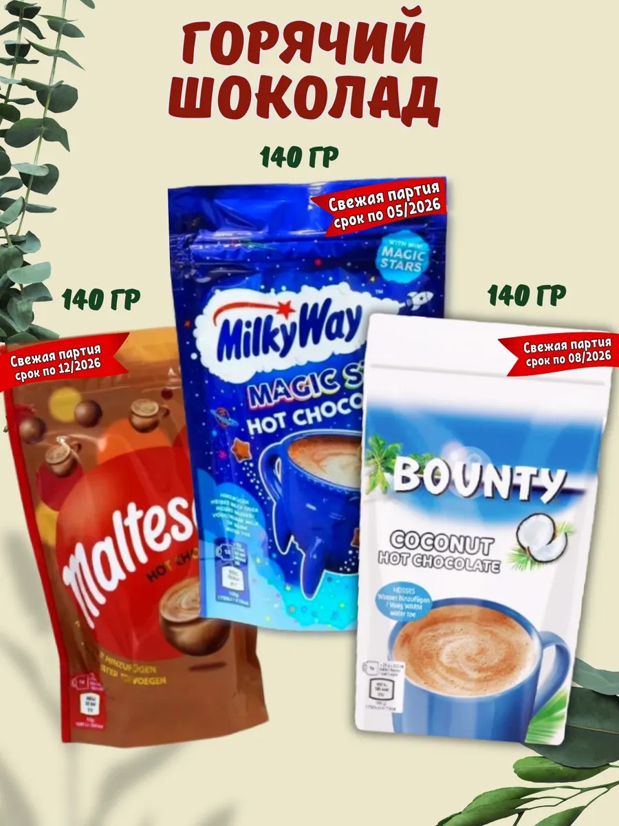 набор сладостей из горячего шоколада Bounty Maltesers Milky Way. Мальтезерс Баунти и Милки Вей! Три пакета с разными вкусами чудесного горячего шоколада, каждый весом по 140 грамм.