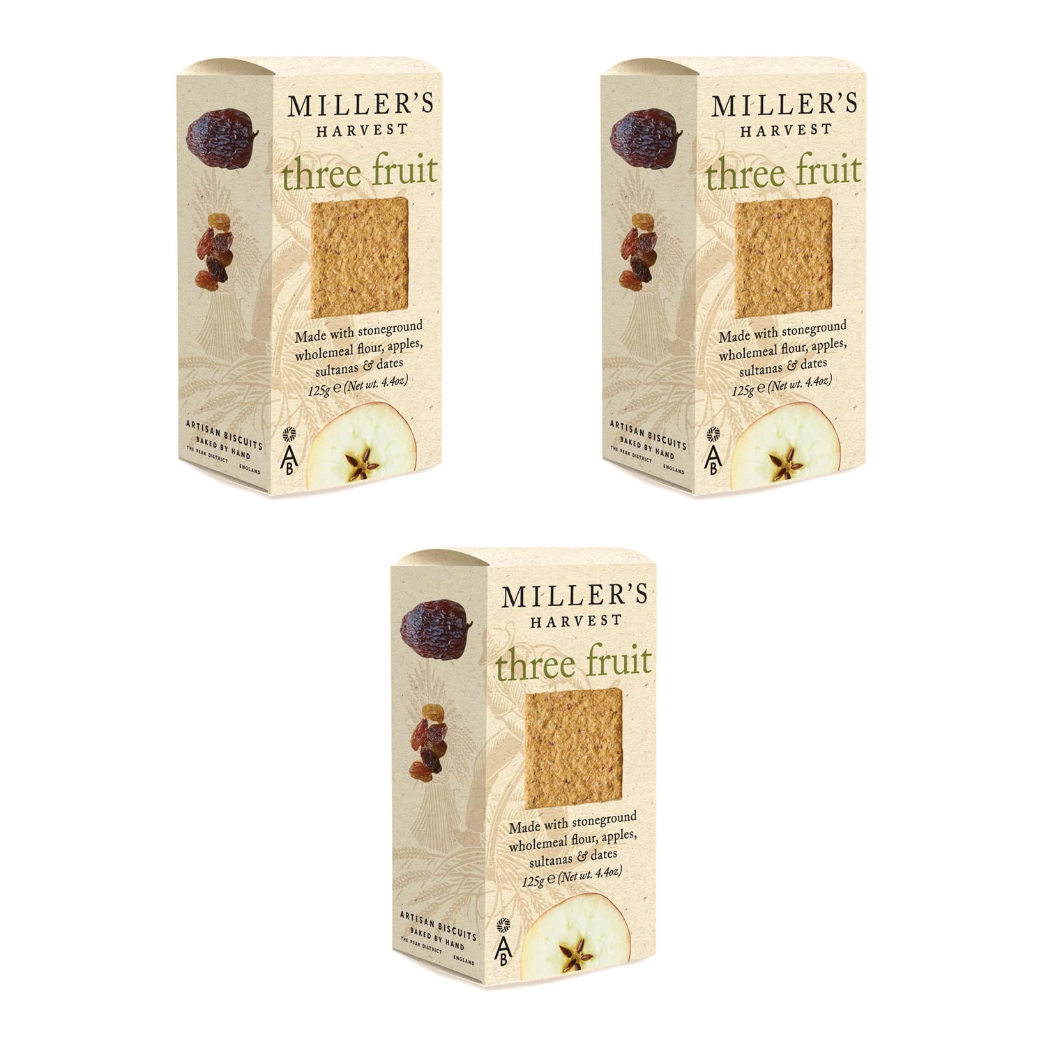 Artisan Biscuits - 3 Miller's Fruit Crackers 125g Made with milled wholemeal flour, apples, sultanas and dates. Ingredients: Stoneground Wholemeal Flour (48 ), Wheat Flour, Chopped Sultanas (15 ), Corn Oil, Dried Apple Pieces (9 ), Chopped Date Paste (6 ), Salt, Dark Muscovado Sugar, Raising Agent (Sodium Bicarbonate), Malt Extract. INGREDIENTS Stoneground Wholemeal Flour (48 ), Wheat Flour, Chopped Sultanas (15 ), Corn Oil, Dried Apple Pieces (9 ), Chopped Date Paste (6 ), Salt, Dark Muscovado Sugar, Raising Agent (Sodium Bicarbonate), Malt Extract.x 125g boxes. Ingredients: Wholemeal flour (48 ), wheat flour, chopped sultanas (15 ), corn oil, dried apple pieces (9 ), chopped date paste (6 ), salt, dark muscovado sugar, raising agent (sodium bicarbonate), malt extract. Made with milled wholemeal flour, apples, sultanas and dates. Artisan Biscuits - 3 Miller's Fruit Crackers 125g. Artisan Biscuits - 3 crackers à fruits Miller's 125 g Fabriqué avec de la farine complète moulue, des pommes, des sultanas et des dattes. Ingrédients : farine de farine complète (48 ), farine de blé, sultanas hachés (15 ), huile de maïs, morceaux de pomme séchée (9 ), pâte de datte hachée (6 ), sel, sucre Muscovado foncé, agent élévateur (bicarbonate de sodium), extrait de malt. INGRÉDIENTS Farine de farine complète Stoneground (48 ), farine de blé, sultanas hachés (15 ), huile de maïs, morceaux de pomme séchée (9 ), pâte de date hachée (6 ), sel, sucre Muscovado foncé, agent élévateur (bicarbonate de sodium), extrait de malt.3 boîtes de 125 g. Ingrédients : farine de farine complète (48 ), farine de blé, sultanas hachés (15 ), huile de maïs, morceaux de pomme séchée (9 ), pâte de datte hachée (6 ), sel, sucre Muscovado foncé, agent élévateur (bicarbonate de sodium), extrait de malt. Fabriqué avec de la farine complète moulue, des pommes, des sultanas et des dattes. Artisan Biscuits - 3 crackers à fruits Miller's 125 g.