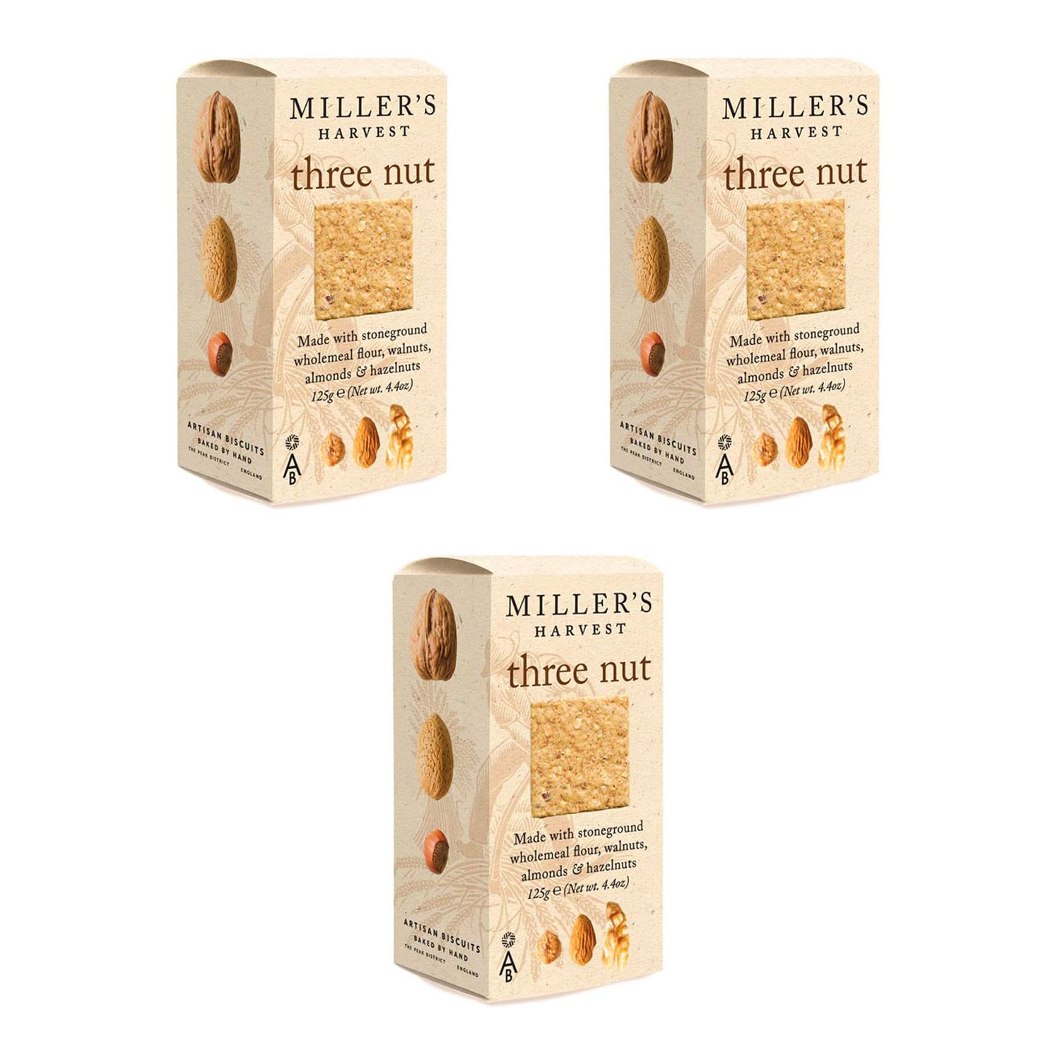 Artisan Biscuits - 3 Miller's Nutcrackers 125g Made with ground wholemeal flour, walnuts, almonds and hazelnuts. Ingredients: Stoneground Wholemeal Flour (52 ) (Wheat), Wheat Flour, Corn Oil, Roasted Hazelnut (7 ), Flaked Almonds (7 ), Ground Walnuts (3 ), Salt, Raising Agent (Sodium Bicarbonate), Malt Extract, Natural Flavoring. INGREDIENTS Stoneground Wholemeal Flour (52 ) (Wheat), Wheat Flour, Corn Oil, Roasted Hazelnut (7 ), Flaked Almonds (7 ), Ground Walnuts (3 ), Salt, Raising Agent (Sodium Bicarbonate), Malt Extract, Natural Flavoring.x 125g boxes. Ingredients: Wholemeal flour (52 ) (wheat), wheat flour, corn oil, roasted hazelnuts (7 ), flaked almonds (7 ), ground walnuts (3 ), salt, raising agent (sodium bicarbonate), malt extract, natural flavouring. Made with ground wholemeal flour, walnuts, almonds and hazelnuts. Miller's Artisan Biscuits - 3 x 125g Nutcrackers.  Artisan Biscuits - 3 casse-noix Miller's 125 g Fabriqué avec de la farine complète moulue, des noix, des amandes et des noisettes. Ingrédients : farine de farine complète (52 ) (blé), farine de blé, huile de maïs, noisette grillée (7 ), amandes en flocons (7 ), noix moulues (3 ), sel, levant (bicarbonate de sodium), extrait de malt, arôme naturel. INGRÉDIENTS Farine de farine complète Stoneground (52 ) (blé), farine de blé, huile de maïs, noisettes broréfiées (7 ), amandes en flocons (7 ), noix moulues (3 ), sel, agent élévateur (bicarbonate de sodium), extrait de malt, arôme naturel.3 boîtes de 125 g. Ingrédients : farine de farine complète (52 ) (blé), farine de blé, huile de maïs, noisette grillée (7 ), amandes en flocons (7 ), noix moulues (3 ), sel, levant (bicarbonate de sodium), extrait de malt, arôme naturel. Fabriqué avec de la farine complète moulue, des noix, des amandes et des noisettes. Artisan Biscuits - 3 casse-noix Miller's 125 g.