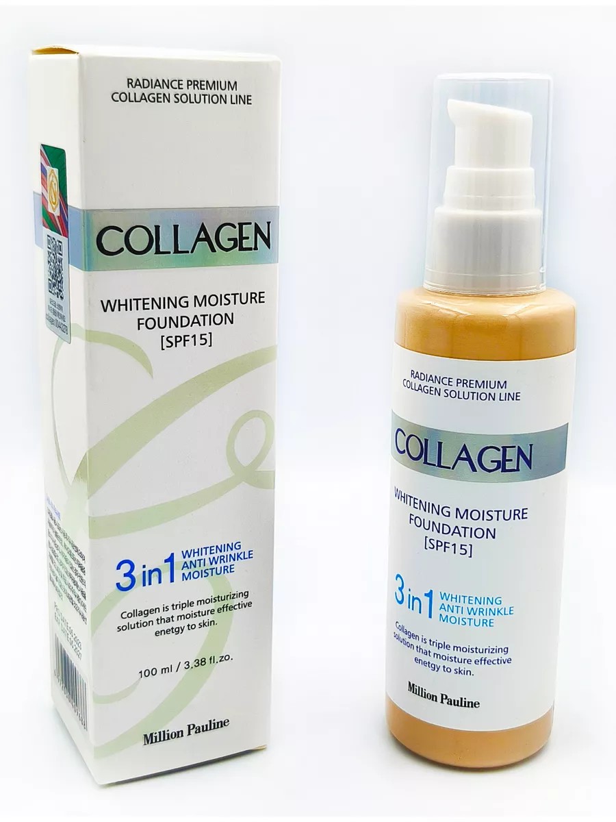 Увлажняющий тональный крем для лица матовый Million Pauline Collagen 3 in 1 SPF15, 100мл. Этот увлажняющий тональный крем идеально ложится на кожу, увлажняя и питая её. Объединяя три ключевых свойства в одном флаконе – увлажнение, антивозрастной эффект и отбеливание, он помогает скрыть любые несовершенства, такие как следы от прыщей, покраснения и пигментацию. Крем с защитой также обладает антивозрастным действием. Его легкое и нежное покрытие обеспечивает стойкость без ощущения тяжести на коже. Он не сушит кожу и придает лицу здоровое сияние. Содержащий коллаген, крем разглаживает структуру кожи и выравнивает тон, а экстракт центеллы азиатской оказывает противовоспалительное и ранозаживляющее действие. Тональное средство с SPF 15 : светлый №13. Слоновая кость. Применение: Нанесите крем на увлажненную кожу, чтобы он ложился тонким ровным слоем и не забивал поры. Выравнивающий и защитный, он помогает не только скрыть несовершенства, но и оказывает лифтинг-эффект. С этим кремом можно добиться как сияющего, так и матового финиша макияжа. Тонирующий и матирующий крем подходит для всех типов кожи: сухой, чувствительной, нормальной, жирной, комбинированной, проблемной и возрастной.
