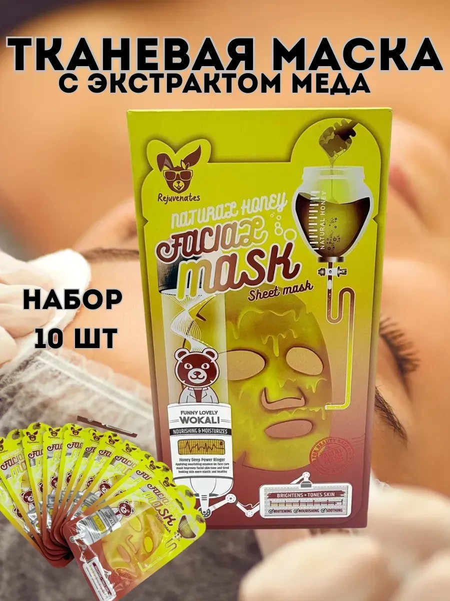 Питательная тканевая маска с мёдом WOKALI (10 шт) – увлажнение, питание и восстановление кожи Откройте для себя силу натурального мёда с тканевой маской WOKALI! Благодаря глубоко увлажняющей и питающей формуле, маска эффективно восстанавливает кожу, повышает её упругость и эластичность, выравнивает тон и придаёт здоровое сияние. Подходит для всех типов кожи, особенно для сухой и чувствительной. В упаковке 10 масок — идеальный курс для полноценного ухода.