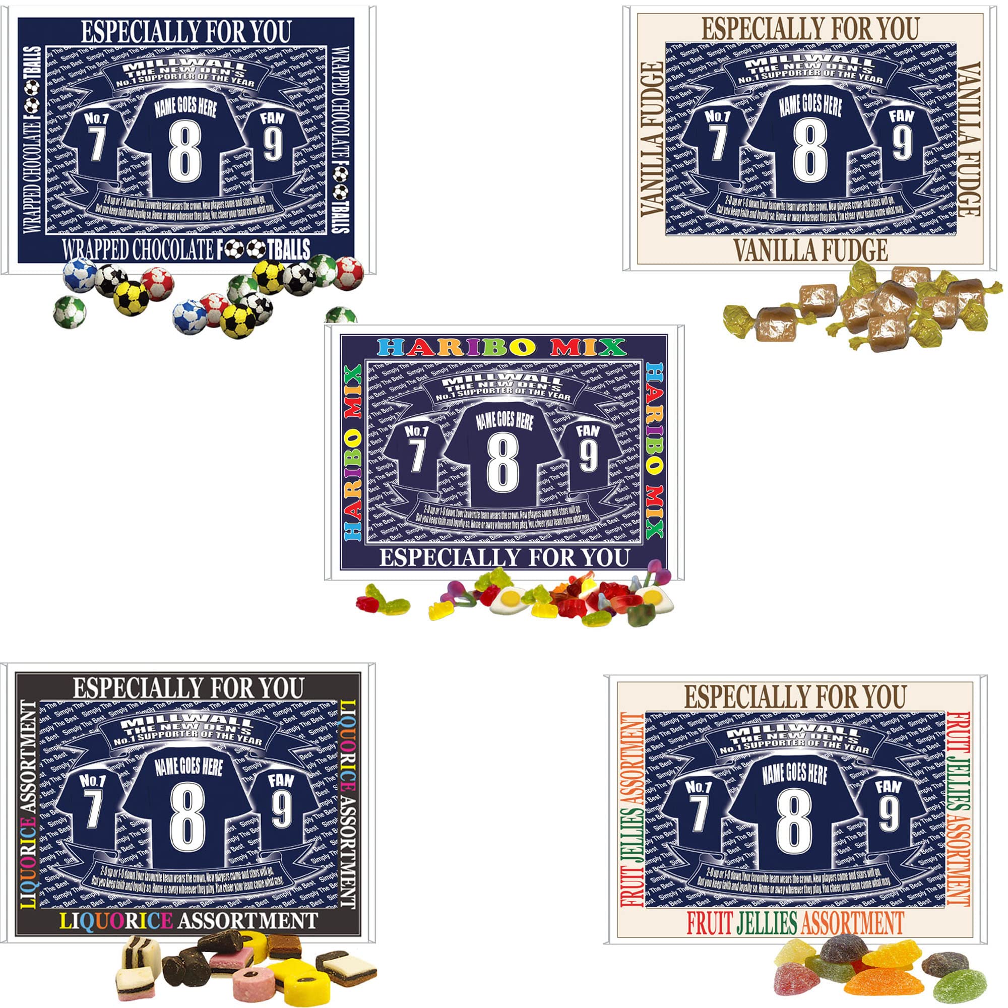 A perfect gift for any avid LIONS FAN. Your favourite football team's shirt image printed onto a box lid containing 200g of your favourite sweets. To make this extra special, you can have a FREE Personalised name added to the box. Ingredients: LIQUORICE ASSORTMENT: Sugar, treacle, wheat flower , glucose syrup, desiccated coconut, vegetable oil, beef gelatine, cornflower, humectant, glycerol, natural colours, plain caramel, beetroot red, curcumin, anthocyanins, capsanthin, fat-reduced cocoa powder, liquorice powder, flavourings, glazing agent. Fruit and vegetable concentrates: Blackurrant, carrot and radish. This product contains wheat. VANILLA FUDGE Assortment Sugar, glucose syrup, full cream condensed milk (milk sugar), vegetable oils (palm kernel palm stearin oil), butter (milk), salt, emulsifier: soya lecithin flavourings. This product may contain egg and nut traces. FRUIT JELLIES ASSORTMENT: Sugar, glucose syrup, water, gelling agent, pectin acid: lactic acid flavourings. Colours: Anthocyanins. Chlorophylls, curcumin, capsanthin. This product may contain nuts, milk, sesame seeds and gluten. CHOCOLATE BALLS Ingredients: Sugar, vegetable oil (palm kernel), whey powder (milk), reduced fat cocoa powder, sorbitan tristearate, soya lecithin, natural bourbon vanilla. Allergens: Milk Soya. FRUIT GUMMIES MIX Sugar, Glucose syrup, dextrose, spirulina, starch, gelatine, acid, citric acid, palm fat, watergelatine, caramelised sugar syrup, flavouring fruit and plant concentrates apple, aronia, blackcurrant, elderberry, grape, kiwi, lemon, mango, nettle, orange, carrot, passion fruit, spinach glazing agents: beeswax carnauba wax, palm fat, water gelatine, colour: copper complexes to chlorophyll, invert sugar syrup elderberry extract, carob extract Any image or text displayed on this unofficial product has been independently produced and is in no way connected with, or endorsed by, the personalities, people, agents or organisations they may appear to depict. INGREDIENTS Liquorice Assortment Sugar, treacle, wheat flower , glucose syrup, desiccated coconut, vegetable oil, beef gelatine, cornflower, humectant, glycerol, natural colours, plain caramel, beetroot red, curcumin, anthocyanins, capsanthin, fat-reduced cocoa powder, liquorice powder, flavourings, glazing agent. Fruit and vegetable concentrates: Blackurrant, carrot and radish. This product contains wheat. Vanilla Fudge Assortment Sugar, glucose syrup, full cream condensed milk (milk sugar), vegetable oils (palm kernel palm stearin oil), butter (milk), salt, emulsifier: soya lecithin flavourings. This product may contain egg and nut traces. Fruit Jellies Assortment Sugar, glucose syrup, water, gelling agent, pectin acid: lactic acid flavourings. Colours: Anthocyanins. Chlorophylls, curcumin, capsanthin. This product may contain nuts, milk, sesame seeds and gluten.Manufactured in the UK. Supporting UK Small Businesses. Perfect Gift for Any Occasion. FREE Personalised Name - Up To 12 Characters.