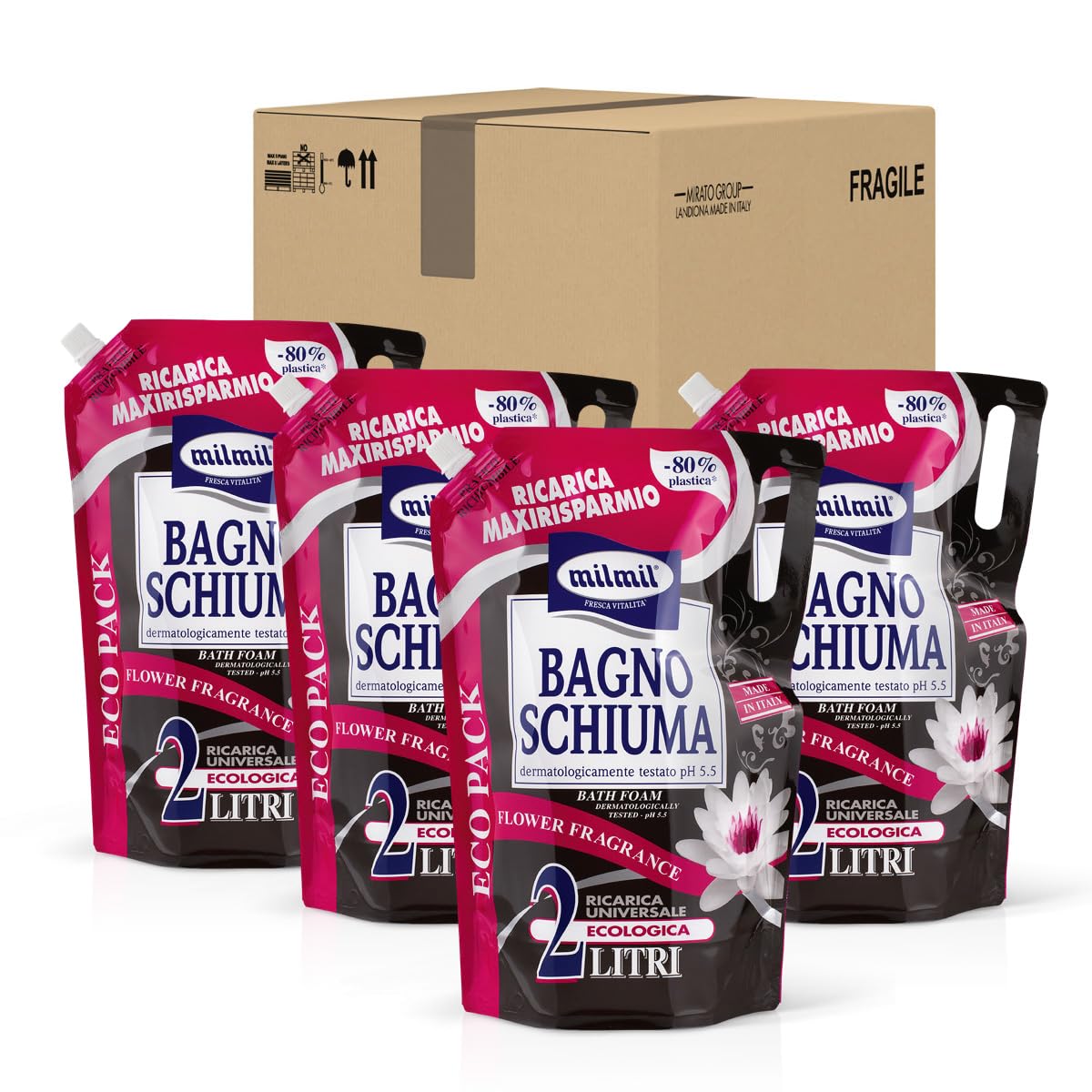 BagnoSHIuma Milmill: The products in the Mil Bath and Shower Foam line are formulated to deeply cleanse the skin while respecting its natural balance. Available in various sizes and fragrances to meet everyone's needs. All products are dermatologically tested. Dermatologically tested: The selected components of this foam bath for the body are gentle on the skin, thanks to their physiological pH. Size: Convenient 2-liter bag. Daily hygiene: This soap is designed and formulated for daily hygiene its fragrance provides a pleasant feeling of well-being and relaxation while giving the body a fresh, invigorating sensation. Flower fragrance: Thanks to its soft and delicate floral scent and creamy formula, this bath foam helps maintain the healthy, natural beauty of your skin.