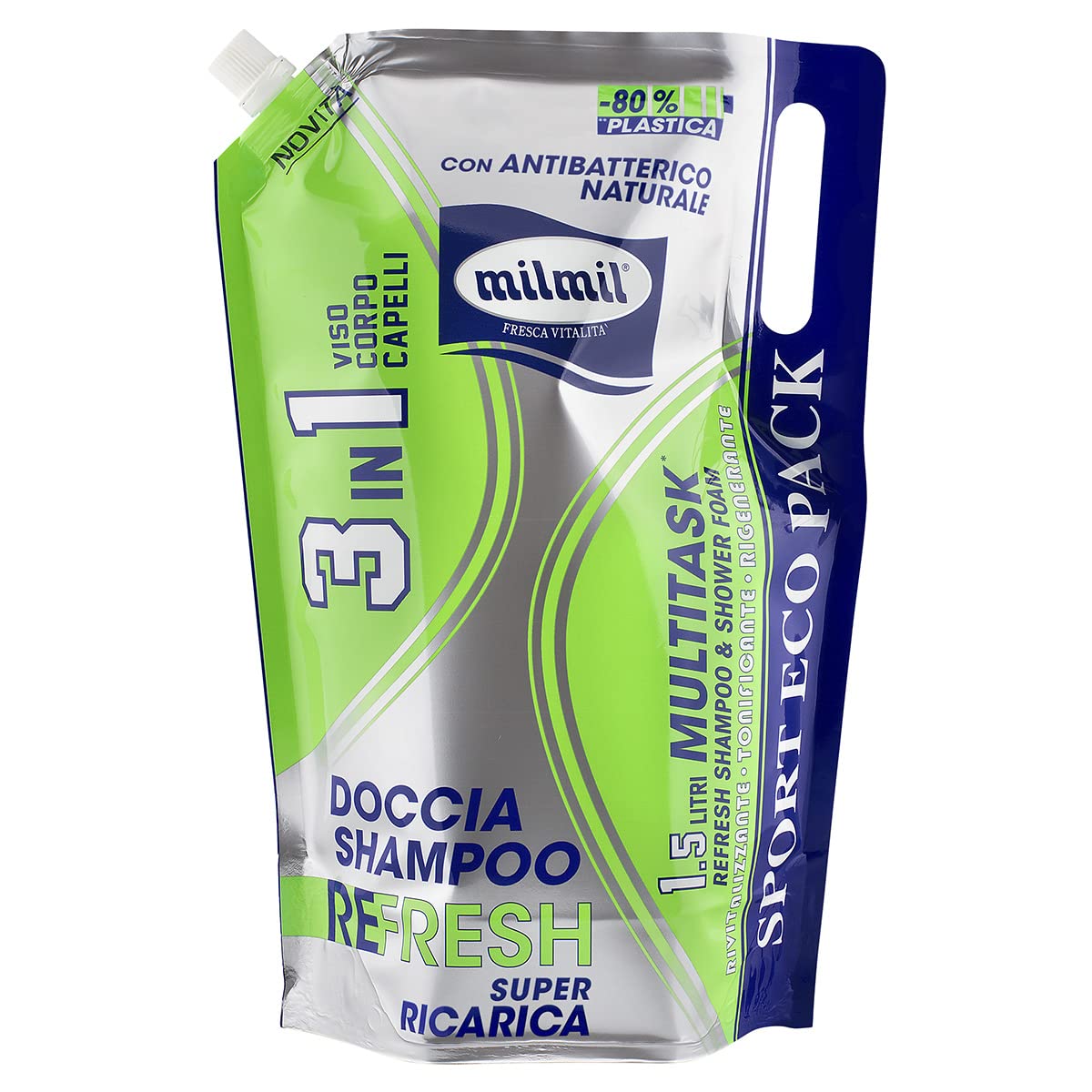 After sports, swimming, or while traveling, thanks to its special 3-in-1 formula with natural antibacterial agents and its unisex fragrance, REFRESH shower shampoo cares for the body, face, and hair in one step, leaving a revitalizing, invigorating, and regenerating feeling. It's the ideal solution for those who want to combine convenience with savings. The MILMIL brand simplifies the beauty routine, even for everyday use away from home. New formulas in convenient refill pouches for healthy and healthy hygiene. Less volume, less carrying, better hygiene. This pack contains 1.5 liters of shower shampoo, suitable for refilling all bottles with dispensers, flip-top dispensers, and push-pull dispensers.Dermatologically tested. Safe product, dermatologically tested. Convenient: less bulk, less transport, better hygiene. This pack contains 1.5 liters of shower shampoo, suitable for refilling all bottles with dispensers, flip-top dispensers, and push-pull dispensers. MILMIL: The MILMIL brand simplifies your beauty routine, even for everyday use away from home. Formula: Special formulation with a pleasant unisex fragrance, cares for hands, face, and body in one step, leaving skin feeling revitalized. 3-in-1: After sports, swimming, or while traveling, thanks to its special 3-in-1 formula with natural antibacterial agents and its unisex fragrance, the REFRESH shower shampoo cares for your body, face, and hair in one step, leaving skin feeling revitalized, invigorated, and regenerating, making it the ideal solution for those who want to combine convenience with savings.MIL MIL SACHET VISAGE CHEVEUX ET CORPS 1500MLDESCRIPTION DU PRODUIT Après le sport, la piscine ou en voyage, grâce à sa formule spéciale 3 en 1 avec antibactérien naturel et son parfum mixte, le shampooing douche REFRESH prend soin du corps, du visage et des cheveux en un seul geste, donnant une sensation revitalisante, tonifiante et régénérante, devenant la solution idéale pour ceux qui veulent combiner la praticité à l'économie. La marque MILMIL simplifie la routine de beauté, même pour la consommation classique en dehors de la maison. Nouvelles formules dans des pochettes pratiques recharge pour une hygiène saine et mature. Moins de volume, moins de transport, meilleure hygiène. Ce pack contient 1,5 litres de douche shampooing, adapté à la recharge de tous les flacons avec distributeur, distributeurs flip-top et push-pull.Testé dermatologiquement. Produit sûr, testé dermatologiquement. Pratique : moins de volume, moins de transport, meilleure hygiène. Ce pack contient 1,5 litres de douche shampooing, adapté à la recharge de tous les flacons avec distributeur, distributeurs flip-top et push-pull. MILMIL: La marque MILMIL simplifie la routine de beauté, même pour la consommation classique en dehors de la maison. Formule : formulation spéciale au parfum unisexe agréable, prend soin des mains, du visage et du corps en un seul geste, donnant une sensation revitalisante à la peau. 3 en 1 : après le sport, la piscine ou en voyage, grâce à sa formule spéciale 3 en 1 avec antibactérien naturel et son parfum mixte, le shampooing douche REFRESH prend soin du corps, du visage et des cheveux en un seul geste, donnant une sensation revitalisante, tonifiante et régénérante, devenant la solution idéale pour ceux qui veulent combiner la praticité à l'économie.